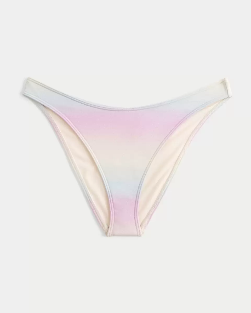 Un joli bas de bikini en tissu doux, scintillant et couvrant. Coupe échancrée, taille mi-haute, coloris dégradé. Importé.
