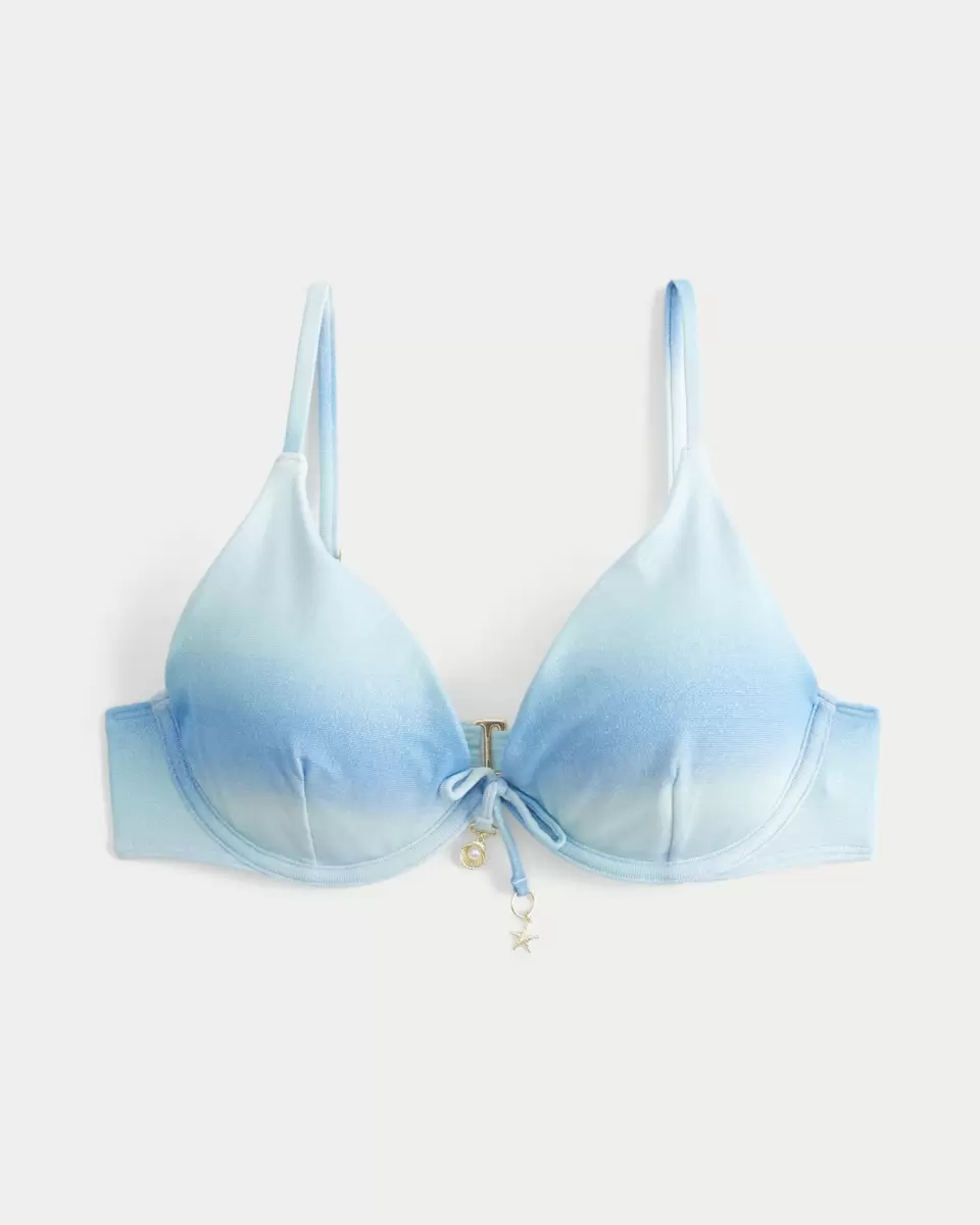Ce joli haut de bikini est confectionné dans un tissu doux et scintillant, avec des détails métalliques. Bretelles réglables, lien à nouer sur le devant, fermeture à crochet en forme de cygne et armatures. Importé.
