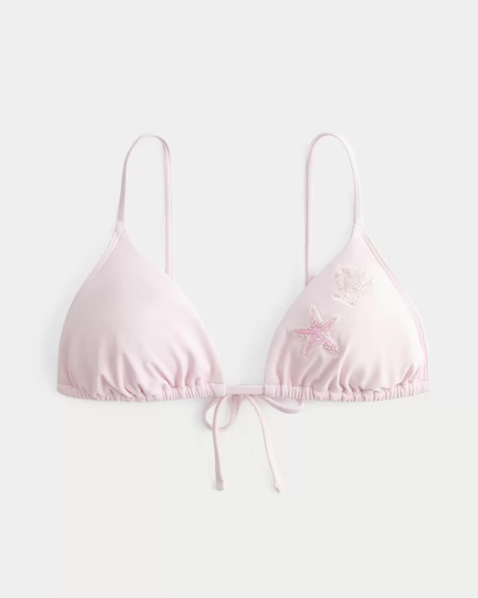Un joli haut de bikini à la coupe triangle, doté de bretelles réglables et d’écussons brodés ornés de perles. Fermeture à nouer, rembourrage amovible. Importé.