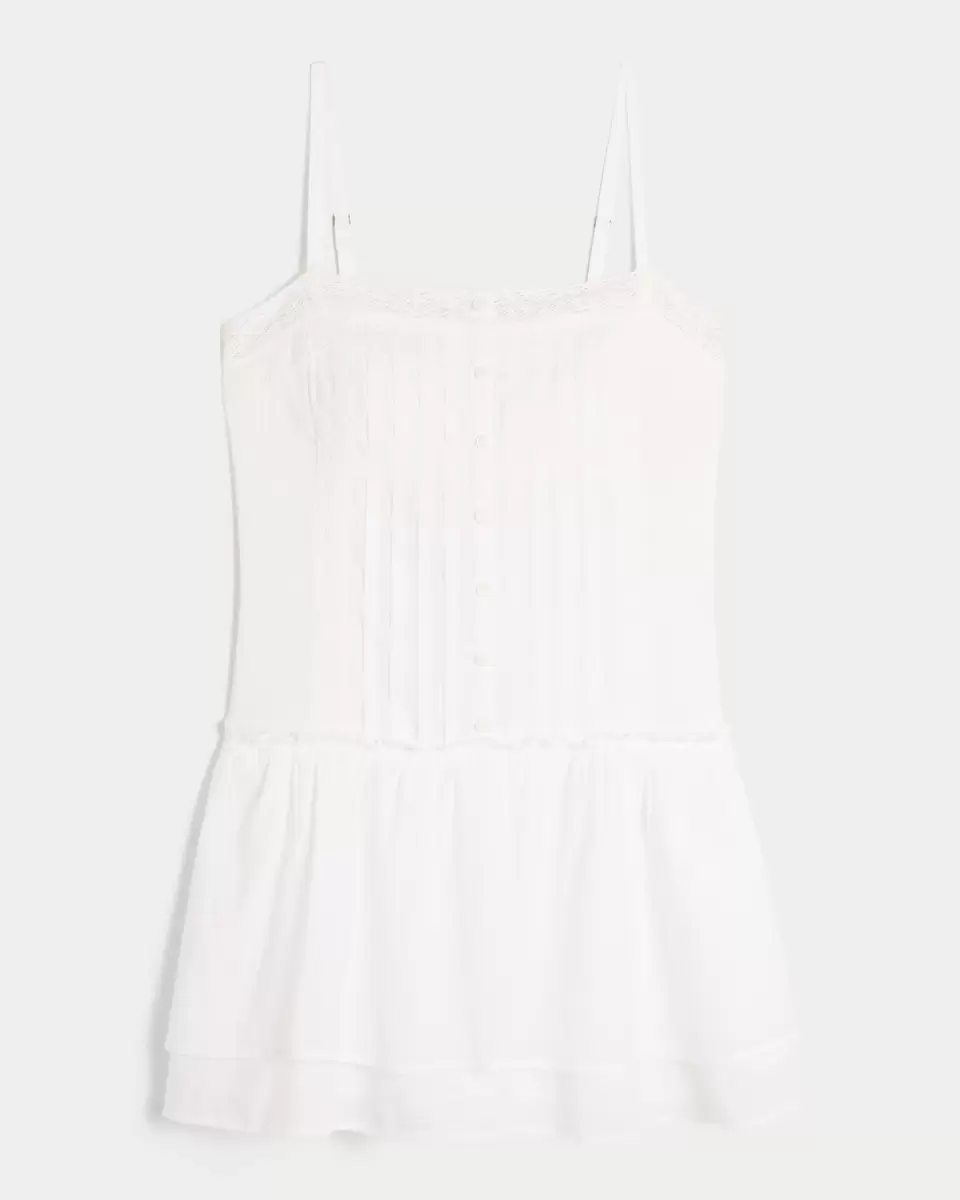 Cette mini-robe super jolie est ornée d’une bordure en dentelle douce le long de l’encolure et d’un bouton central. Plis nervurés et ourlet à volants. Importé.