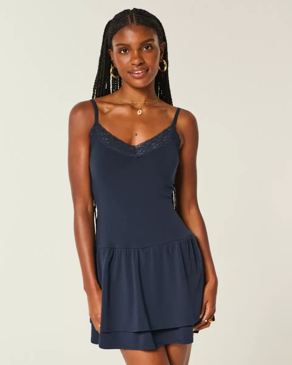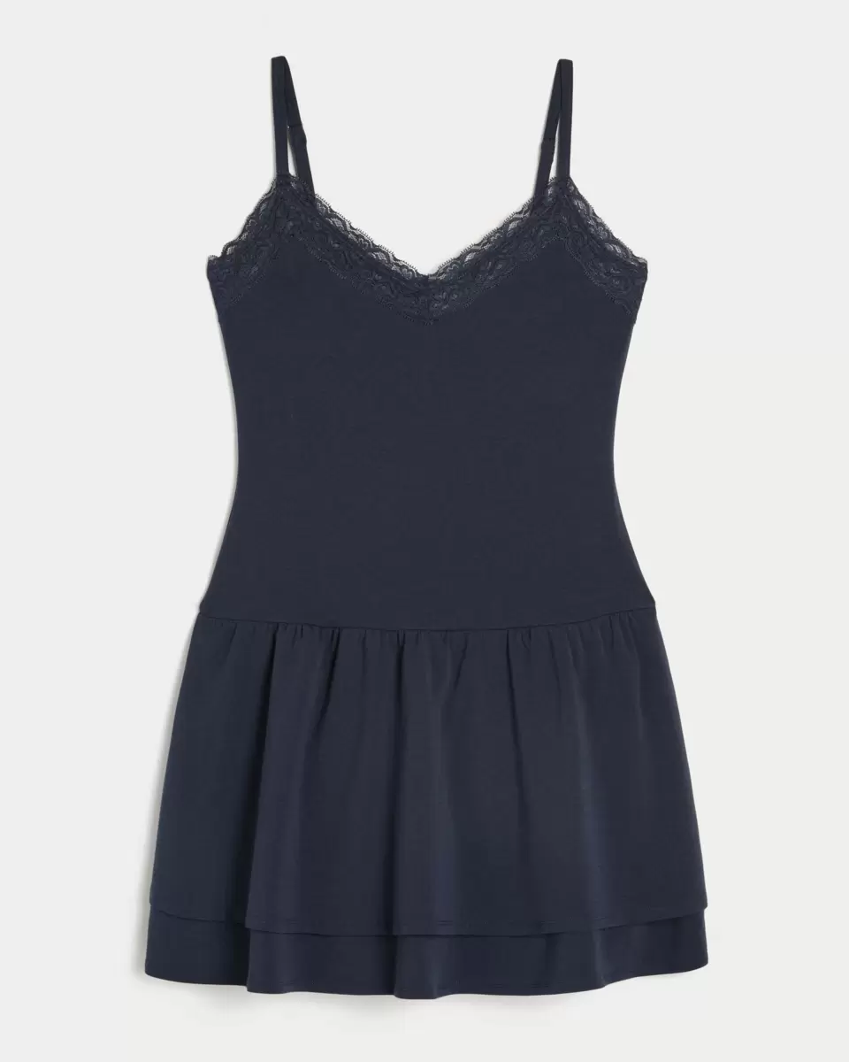 Cette jolie mini-robe style caraco est confectionnée en maille douce et présente un ourlet à volants et une bordure en dentelle le long de l’encolure. Importé.