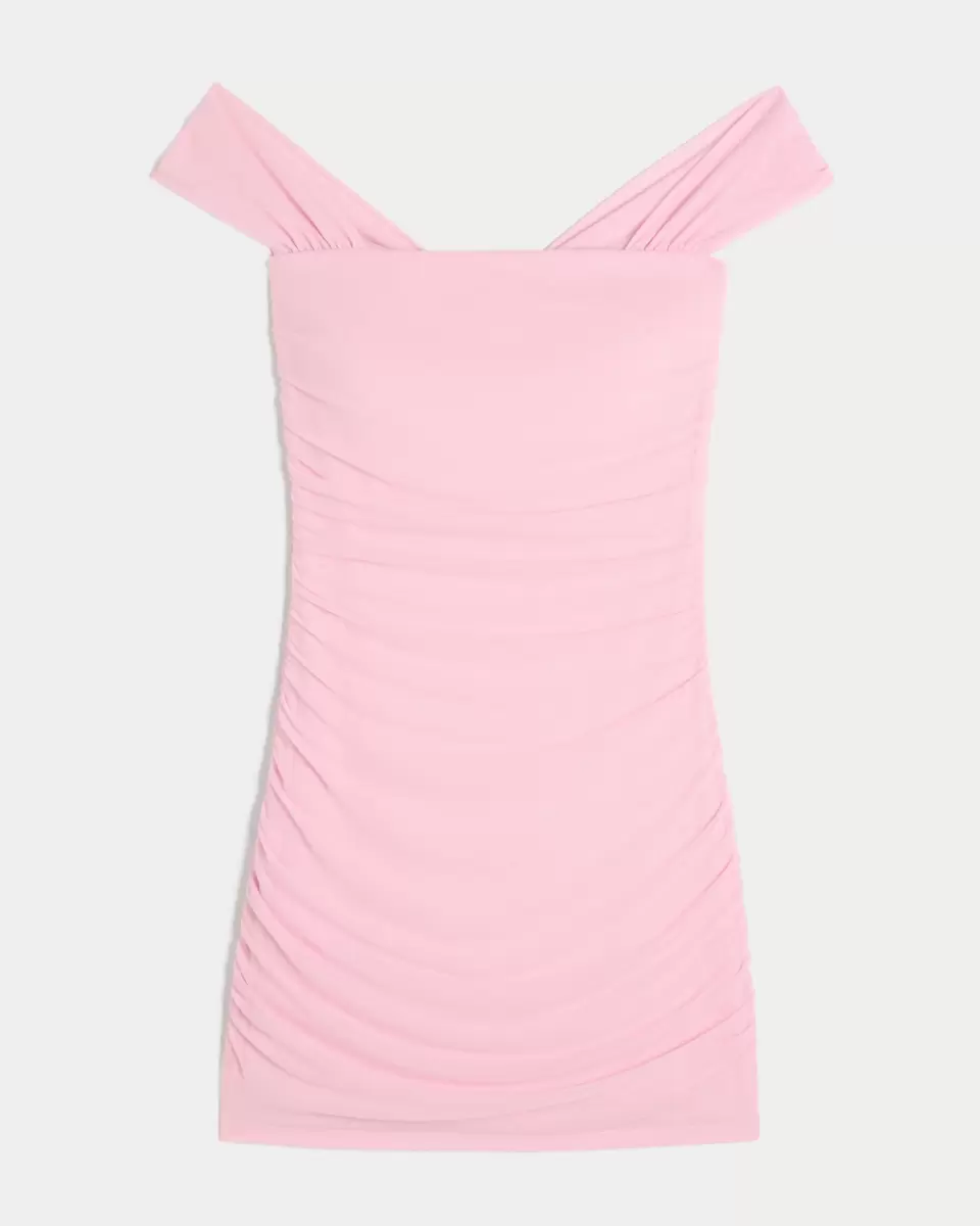 Une jolie robe moulante en tissu résille doux, ornée de détails froncés en cascade de haut en bas. Bretelles dénudées. Importé.