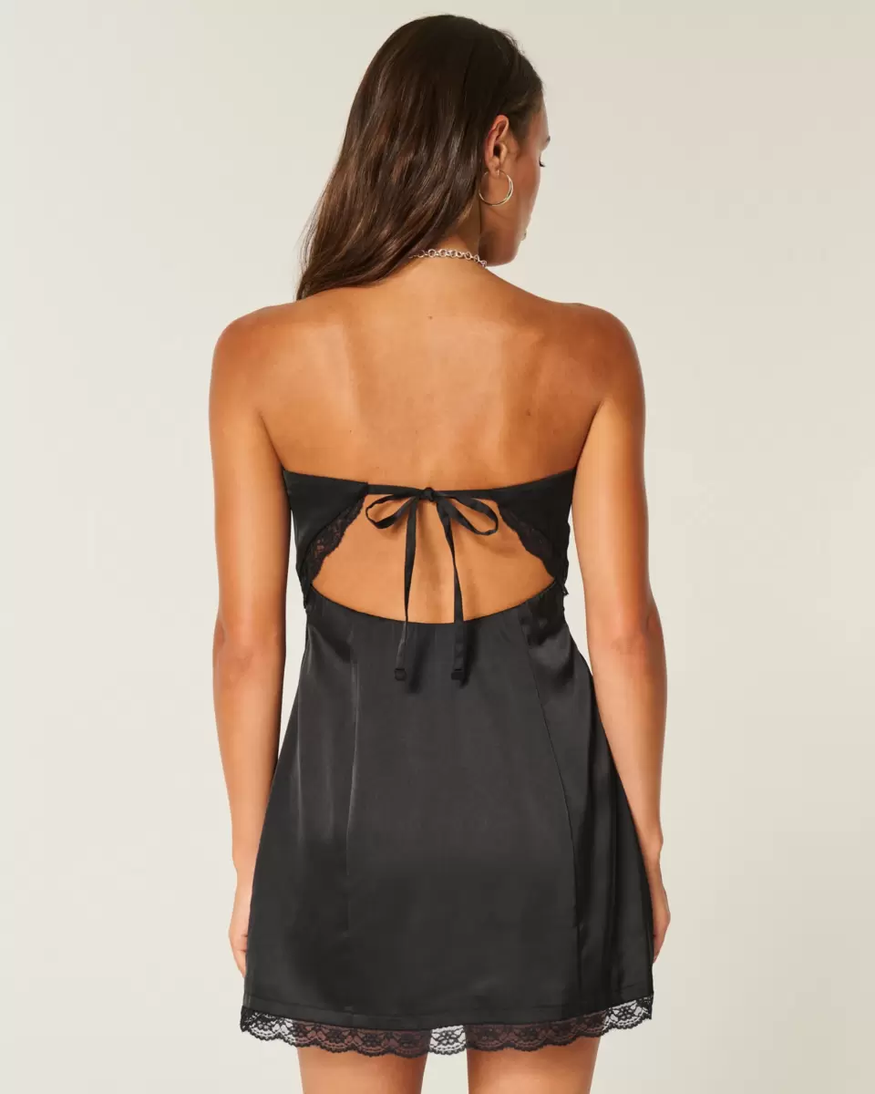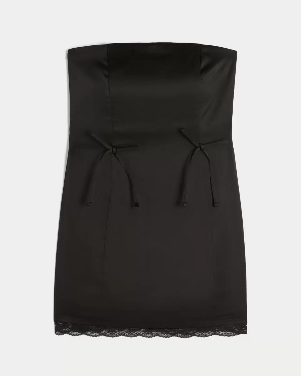 Cette superbe robe est confectionnée en satin doux et présente des nœuds. Sans bretelles, jolie bordure en dentelle à l’ourlet et silhouette moulante. Importé.