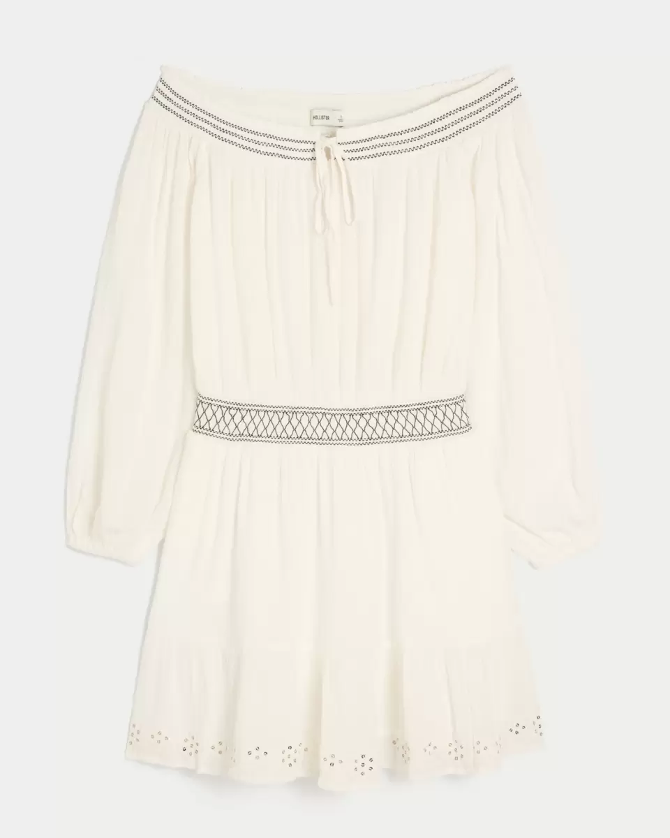 Robe fluide et ultra douce, dotée d’un décolleté décontracté, à porter sur les épaules ou à l’épaule. Lien central à l’encolure, détails surpiqués, broderie anglaise à l’ourlet et manches longues. Importé.