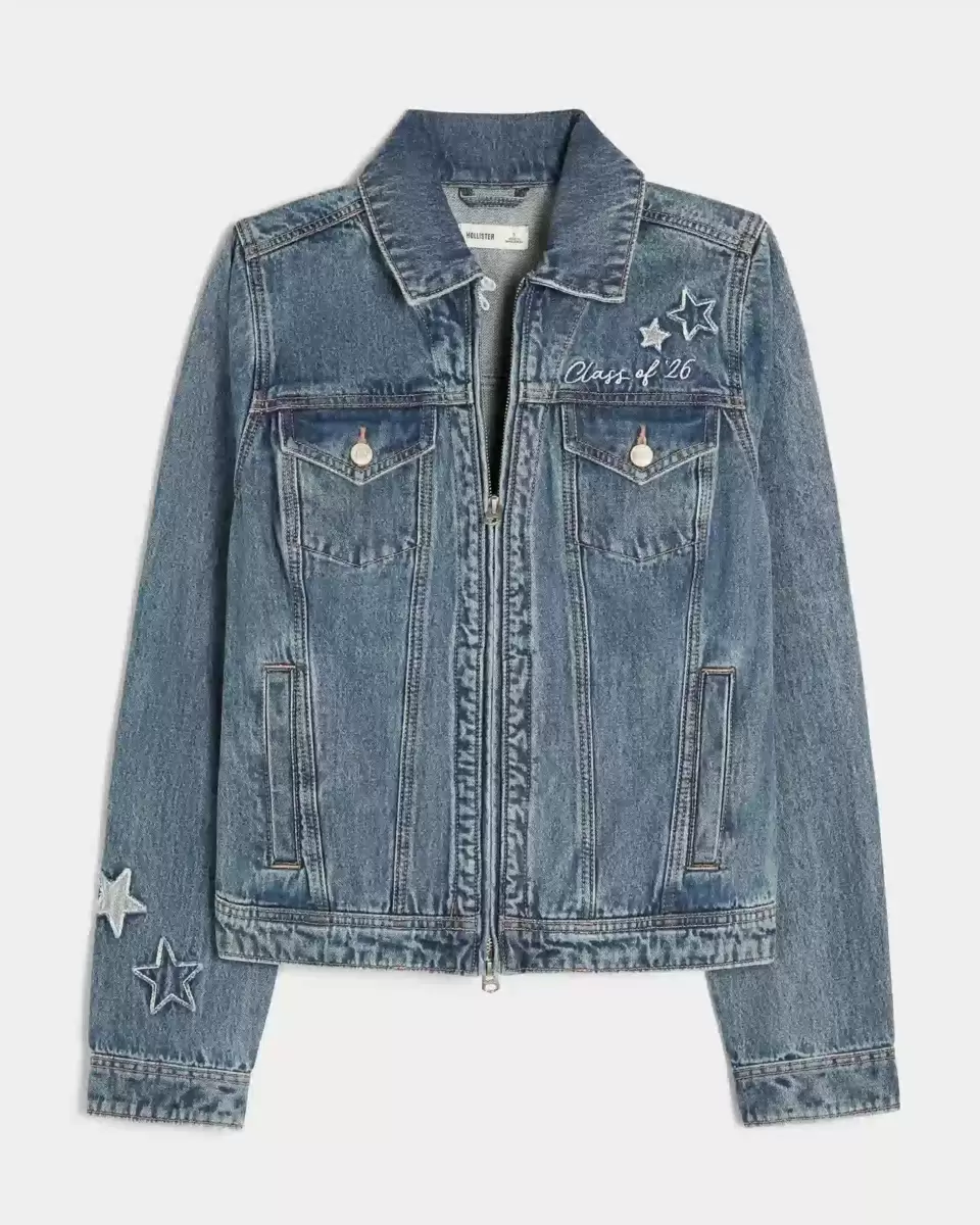Veste en jean classique ornée d’une broderie graphique « Classe de 26 » sur la poitrine gauche et d’une étoile appliquée sur la manche droite. Fermeture éclair sur toute la longueur, col, poches poitrine et poches avant. Importé.