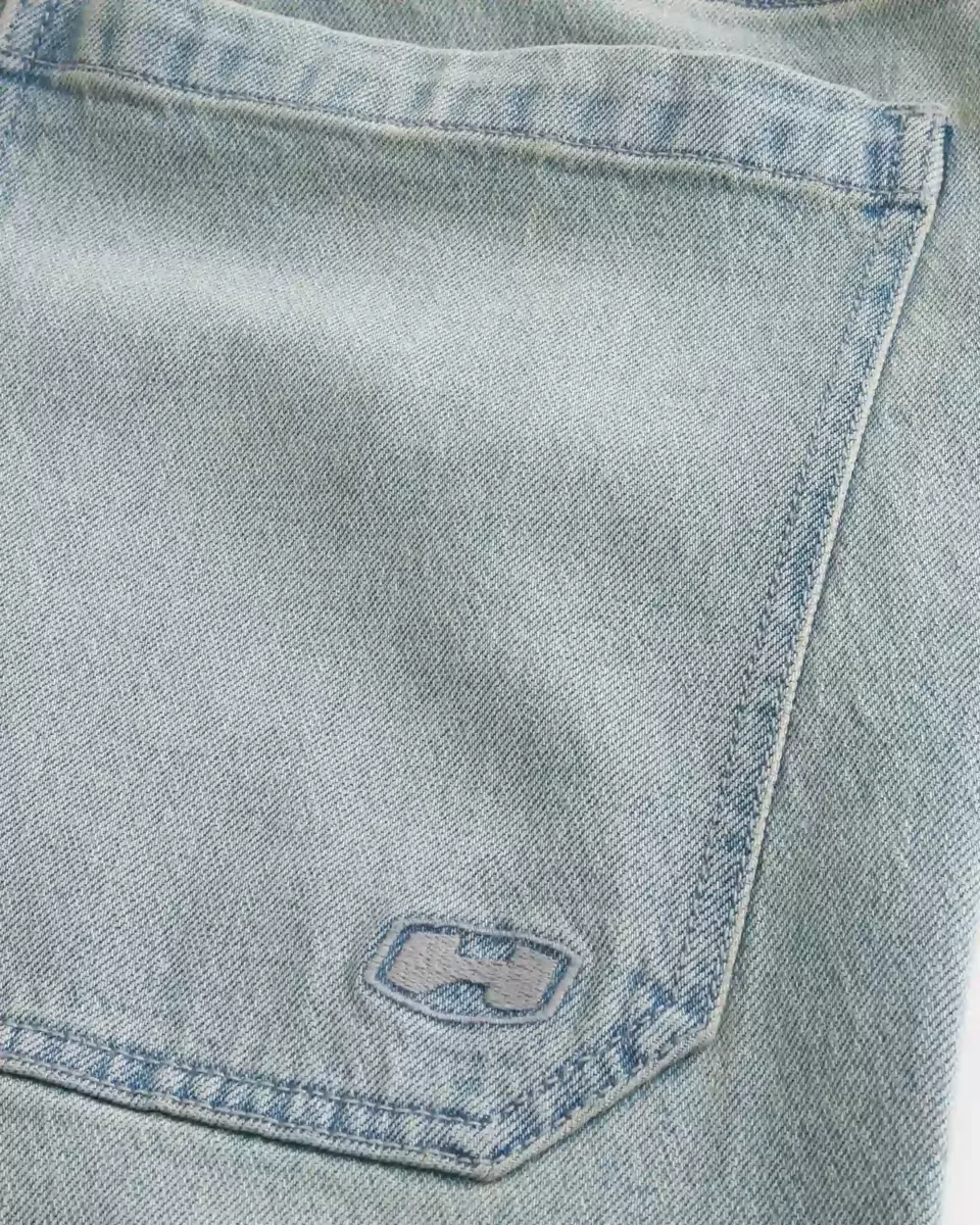 Jean mi-long classique avec jambe ample. Délavage léger, décoloration. Importé.