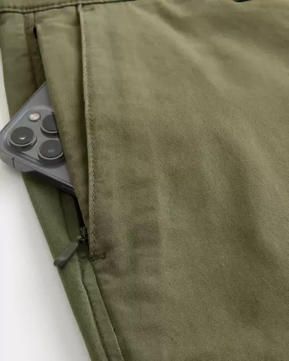 Pantalon chino en sergé extensible ultra-confortable, coupe droite de haut en bas. Poches, dont une poche droite zippée. Importé.