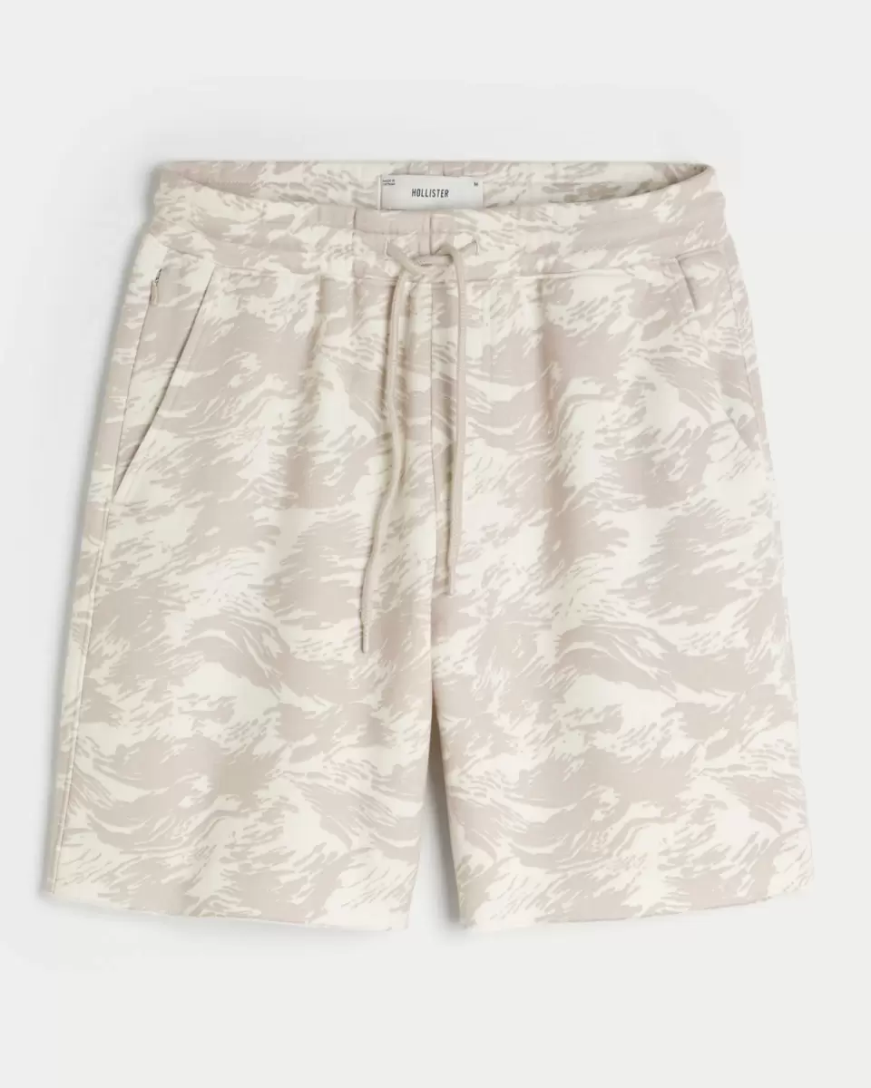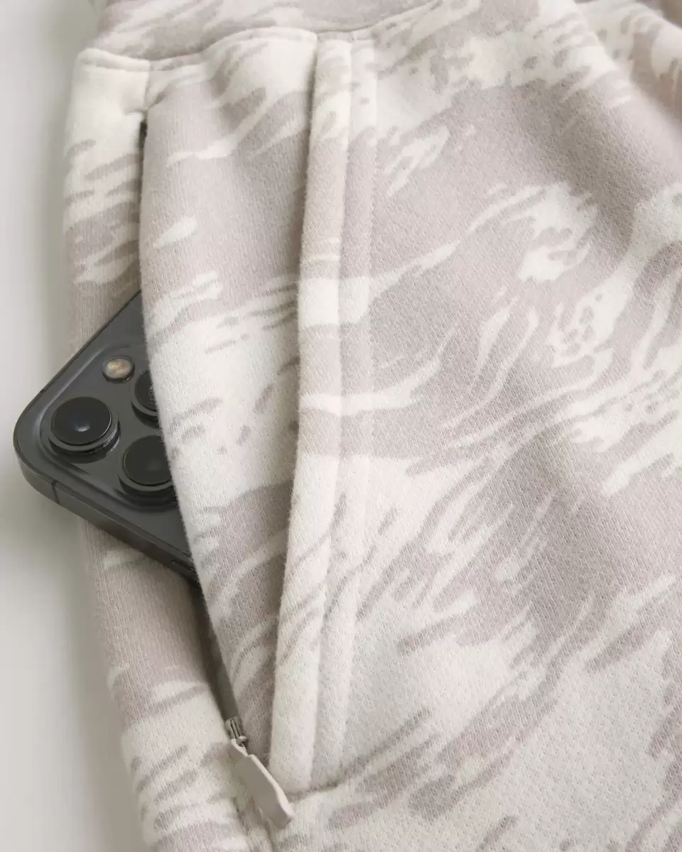 Short en polaire ultra doux. Cordon de serrage à la taille, poches, poche droite zippée, coupe ample, motif camouflage intégral. Longueur au-dessus du genou. Importé.