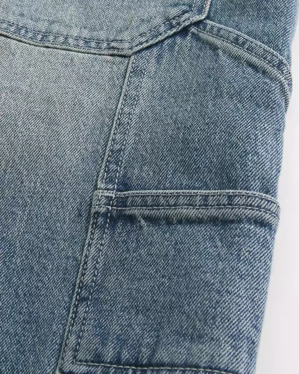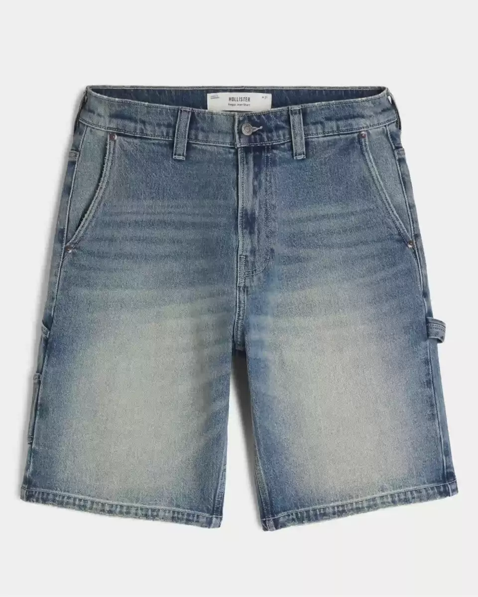 Short en jean classique style peintre, délavage moyen, coupe ample. Détail boucle à gauche, poches supplémentaires, effet délavé et effet moustache. Longueur genou. Importé.