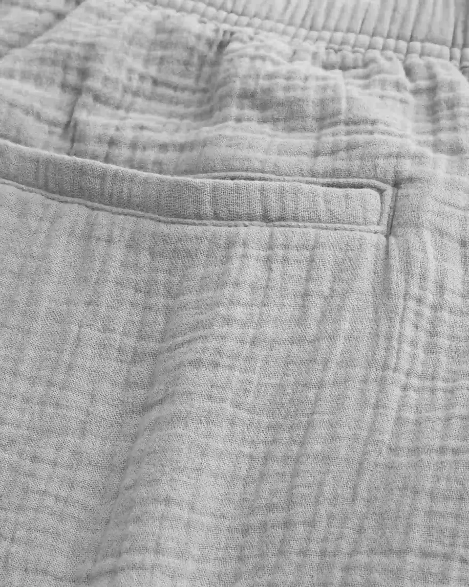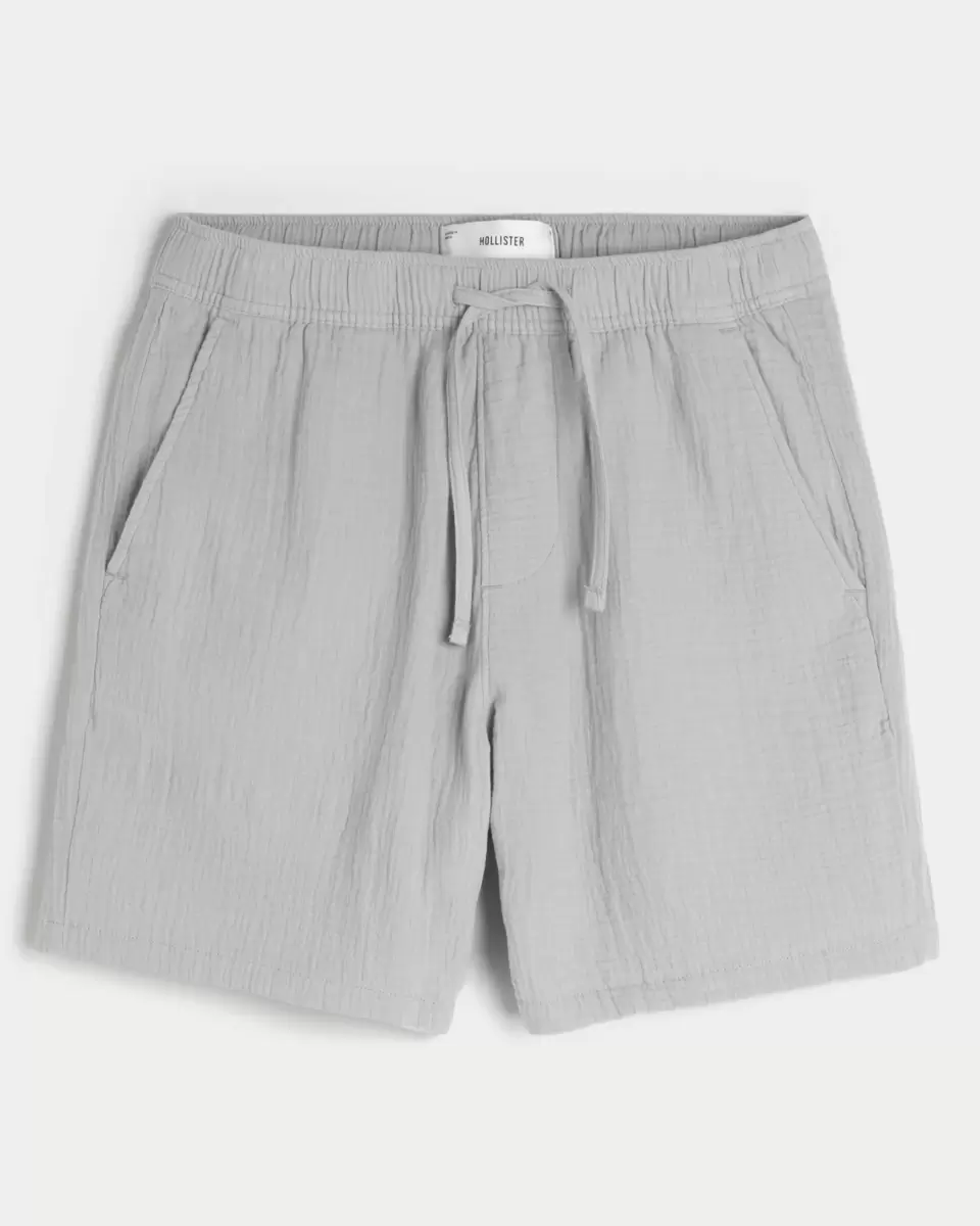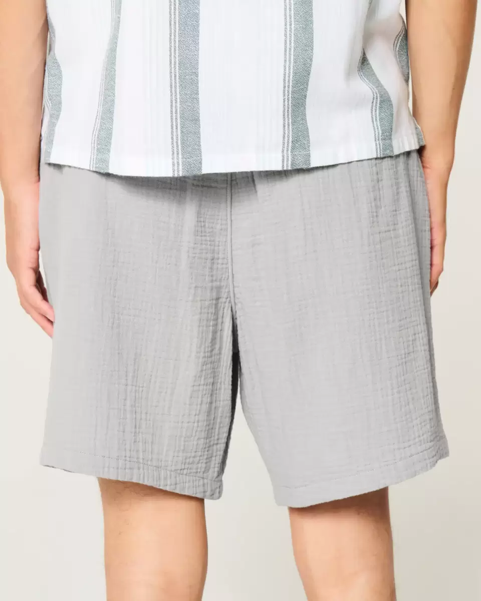 Short ultra-confortable en coton froissé doux. Cordon de serrage à la taille, poches, entrejambe de 20 cm, longueur au-dessus du genou. Importé.
