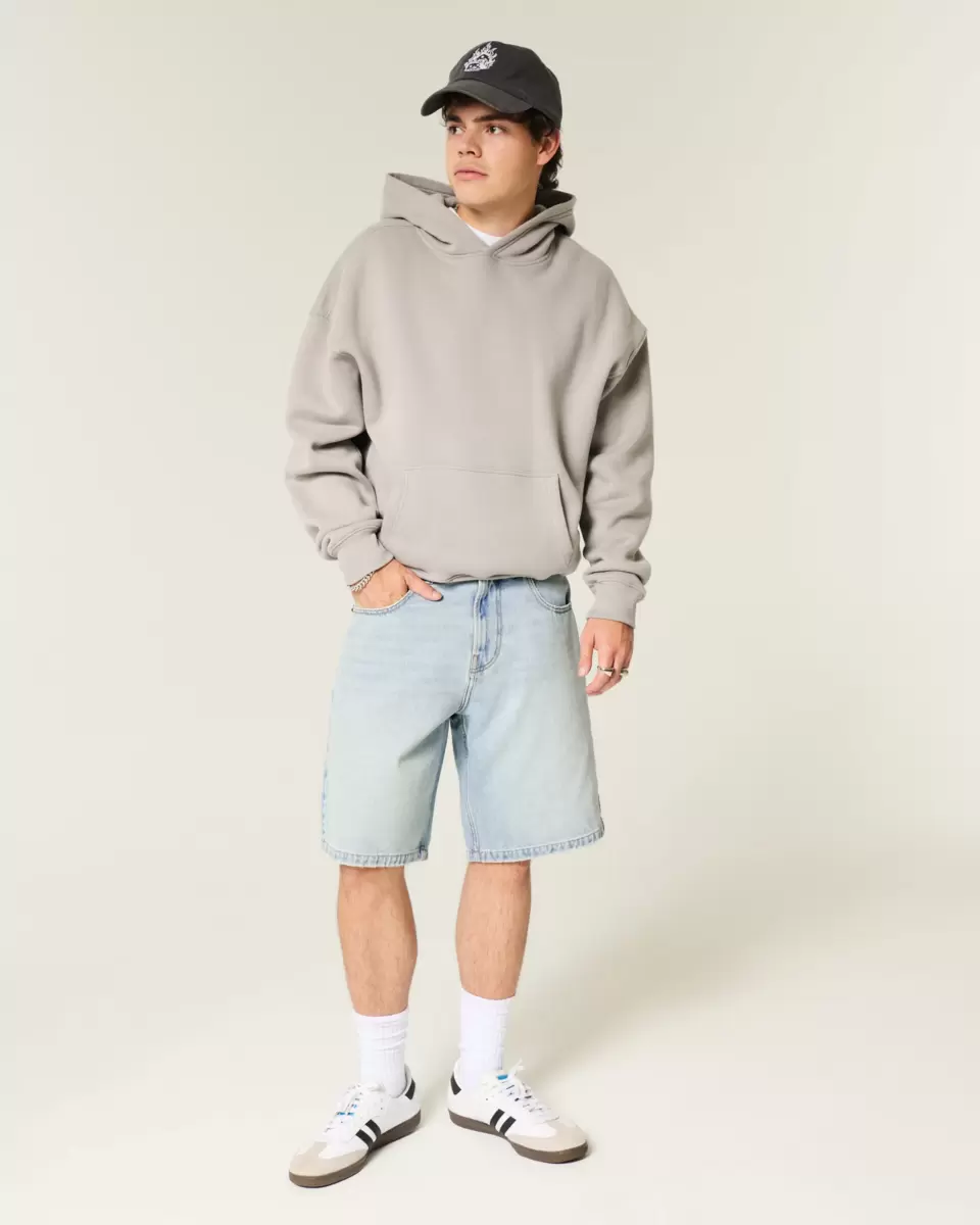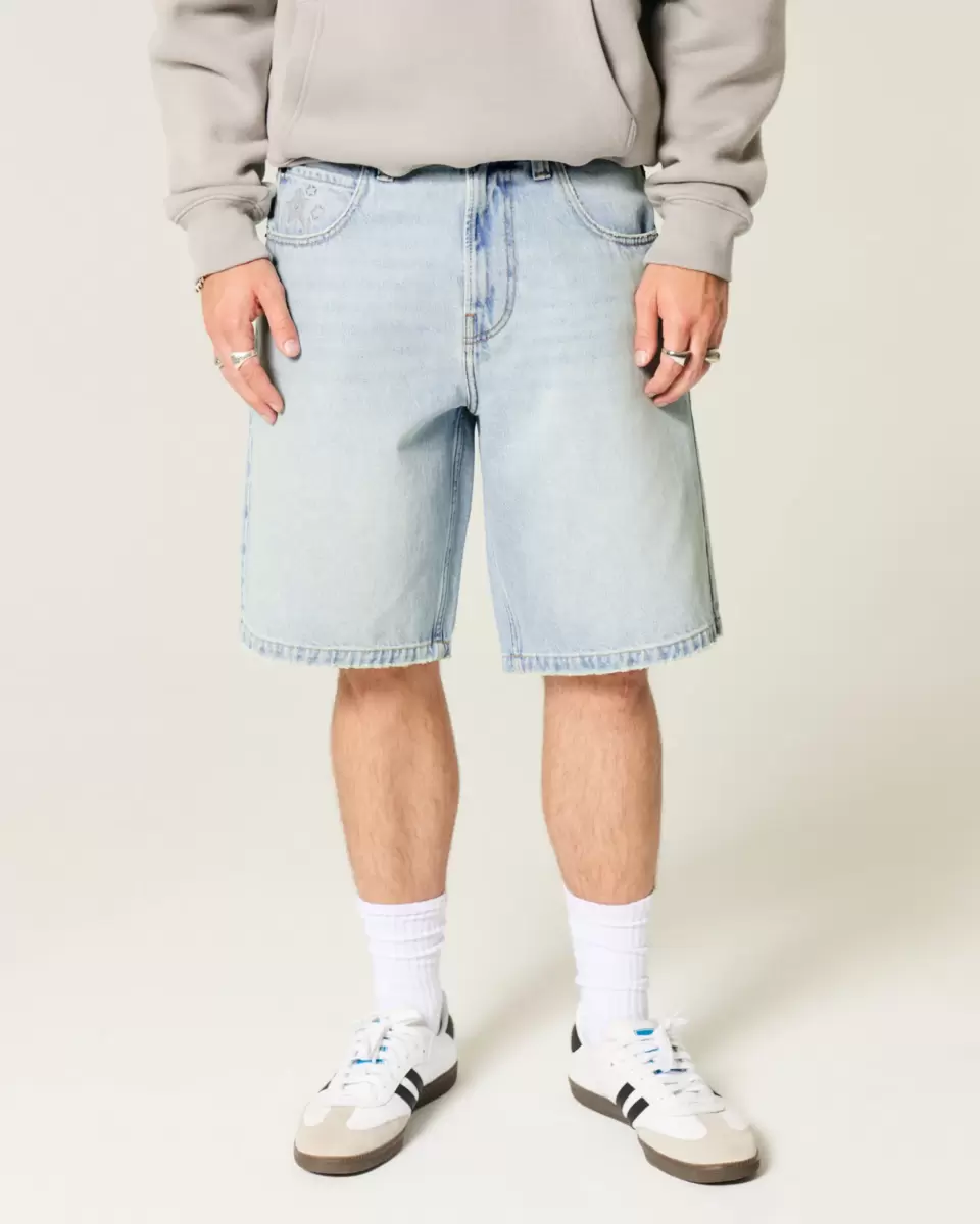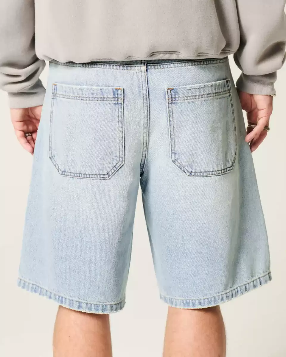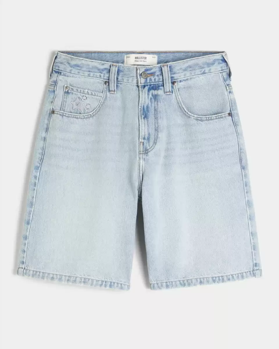 Short en jean confortable, coupe ample, avec broderie étoile sur la poche droite. Décoloration et effet moustaches. Importé.