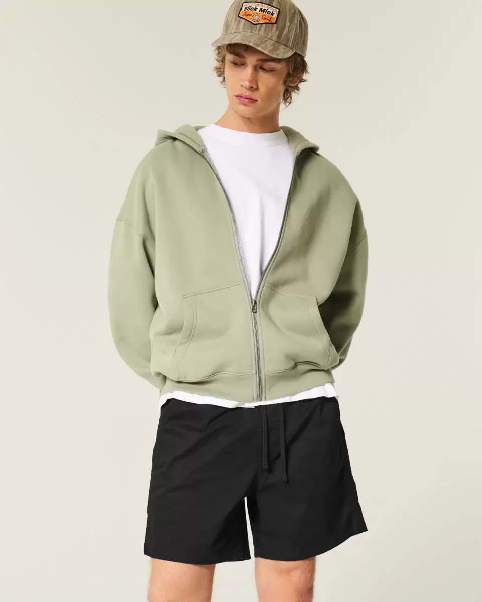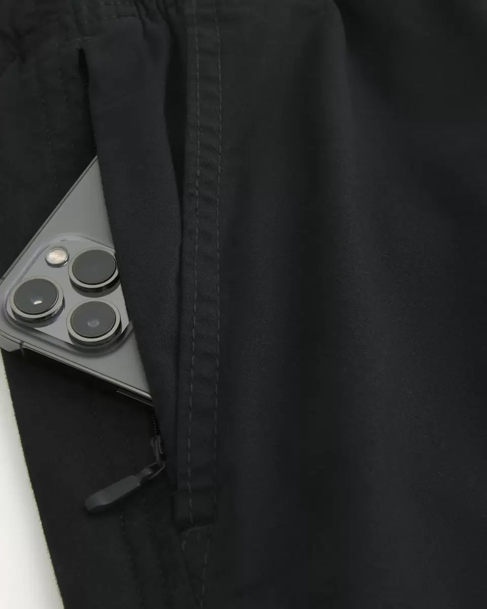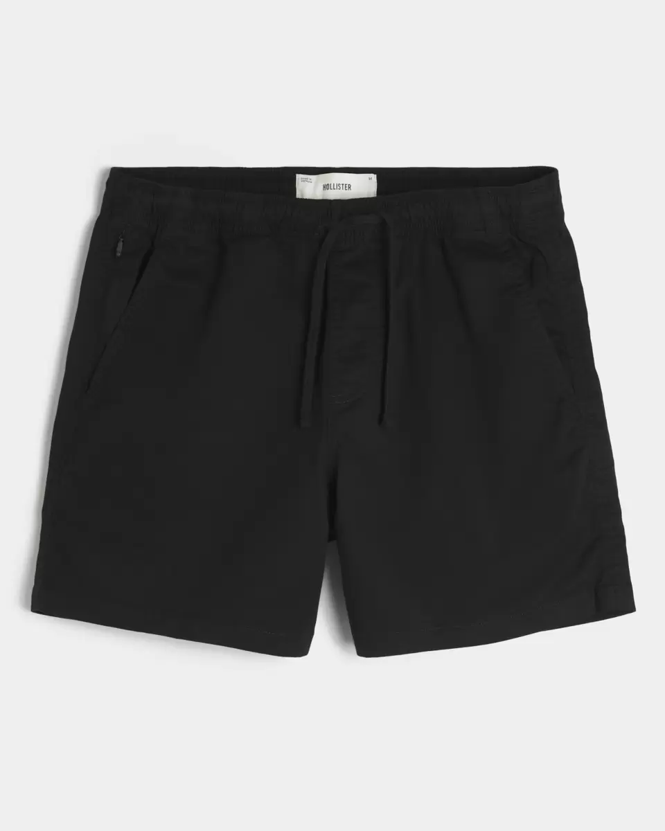 Short confortable en sergé avec cordon de serrage à la taille et longueur mi-cuisse. Poches, poche droite zippée. Importé.