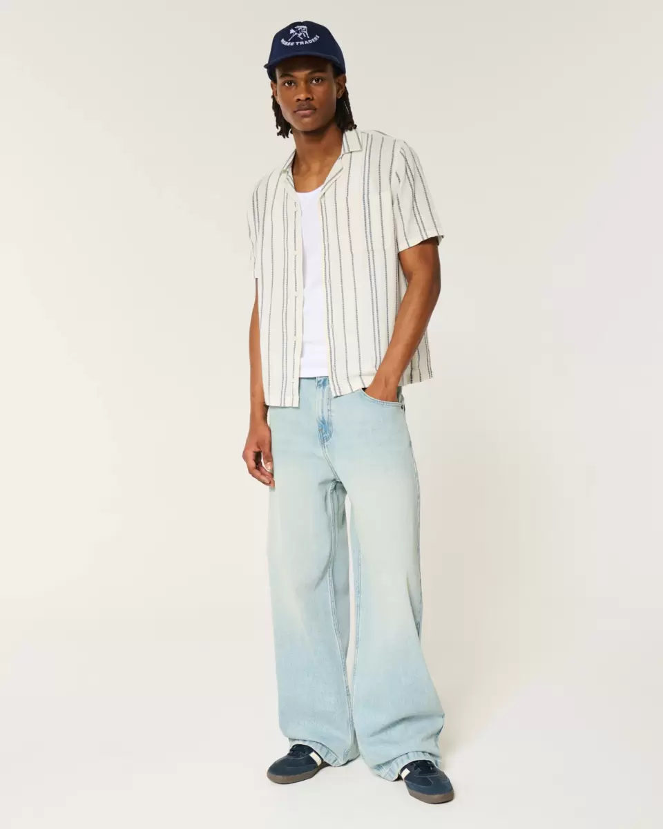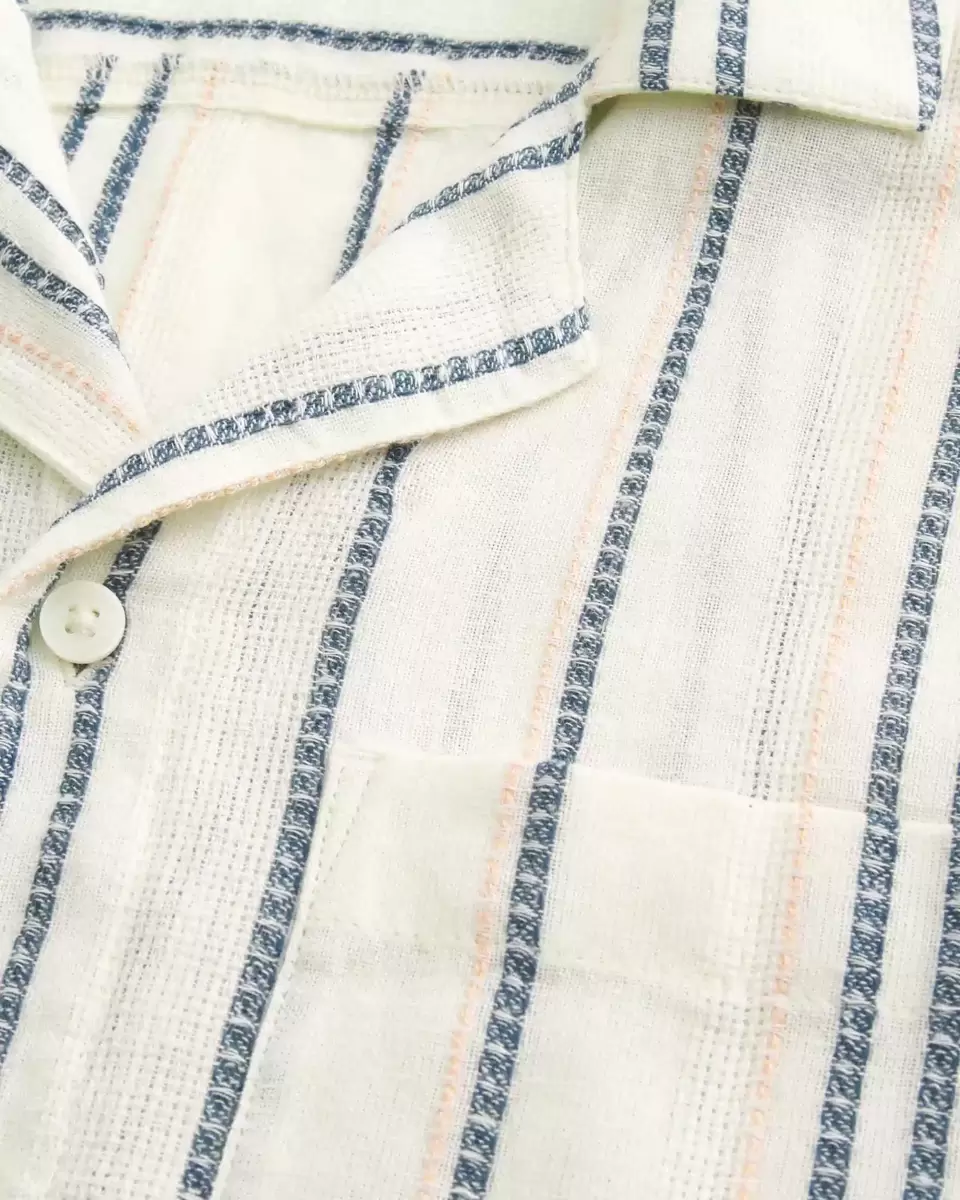 Chemise boutonnée classique en tissu doux et texturé à rayures. Col, manches courtes, poche poitrine gauche. Importé.