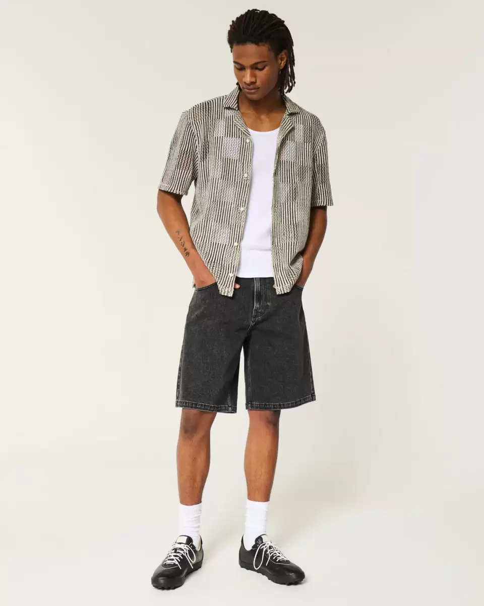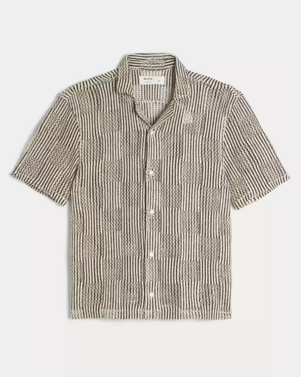 Chemise à manches courtes ultra-confortable en tissu crocheté à motif damier et fermeture boutonnée. Col. Coupe carrée. Importé.