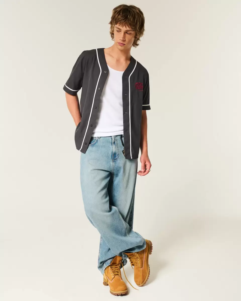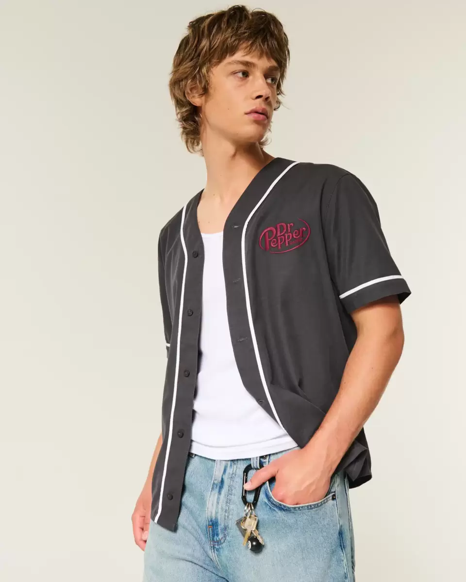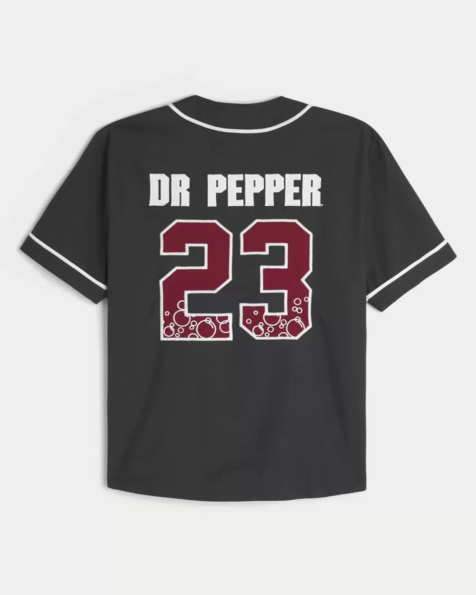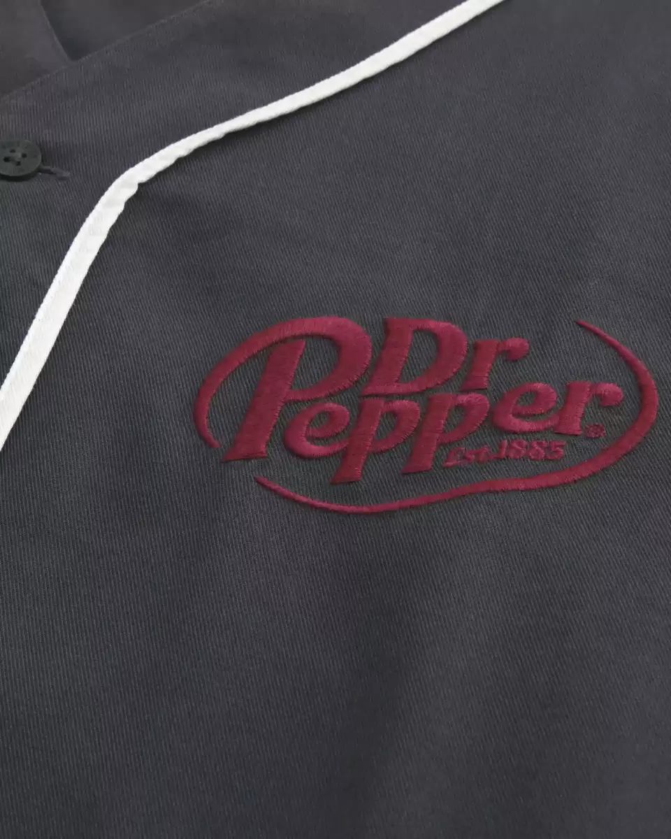Ce maillot de baseball classique arbore une broderie graphique Dr Pepper sous licence officielle sur la poitrine gauche et dans le dos. Fermeture boutonnée, encolure en V et manches courtes. Coupe carrée. Importé.