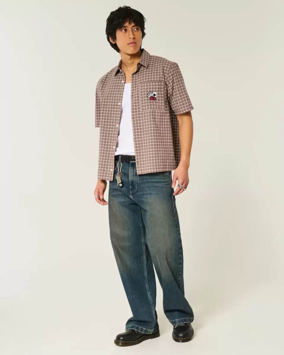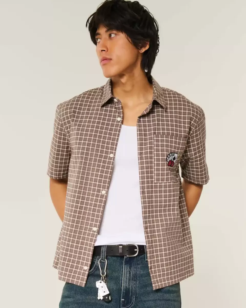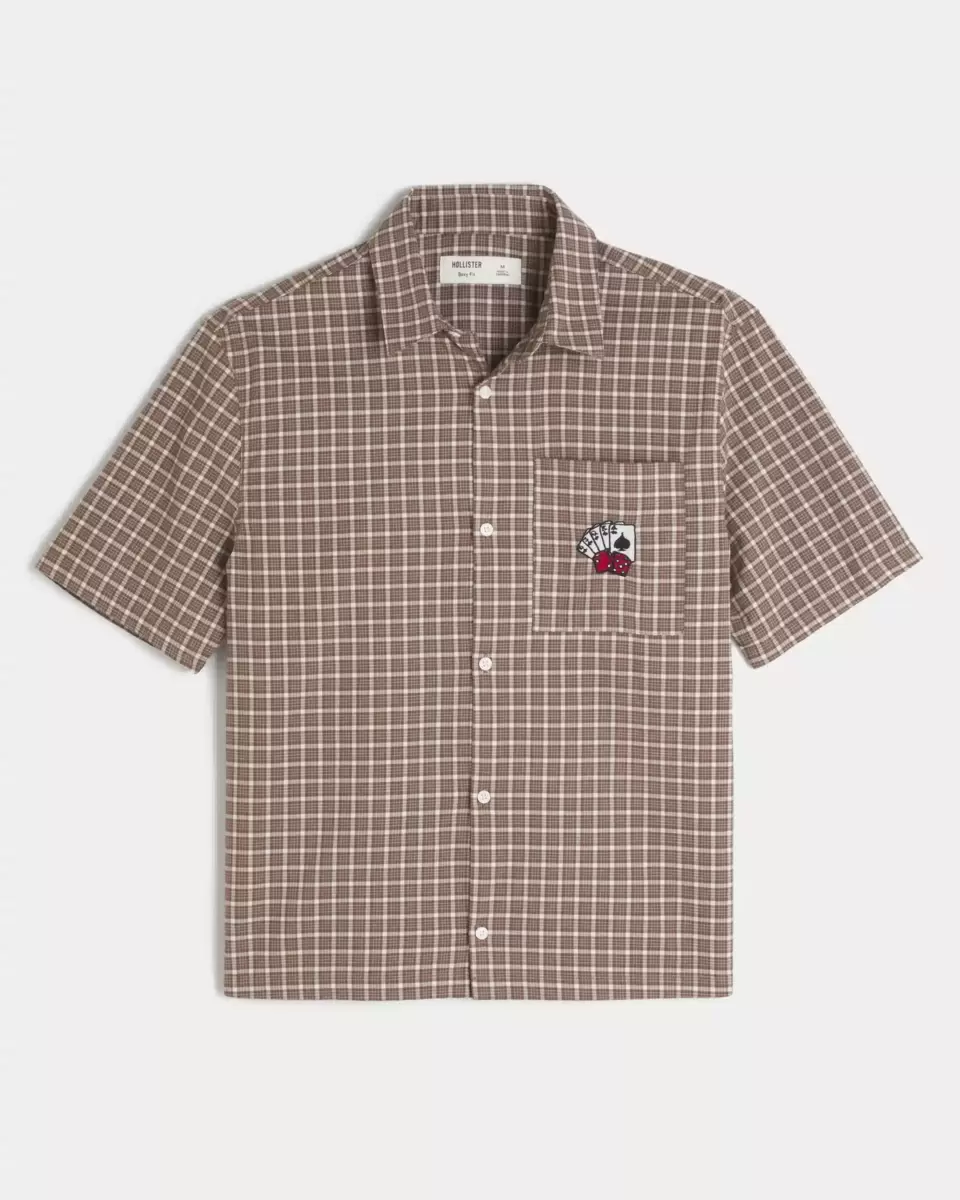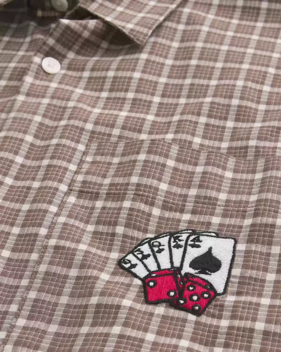 Chemise classique en popeline douce avec broderie graphique de cartes à jouer sur la poche poitrine gauche. Fermeture boutonnée, col, manches courtes, motif à carreaux. Coupe carrée. Importé.