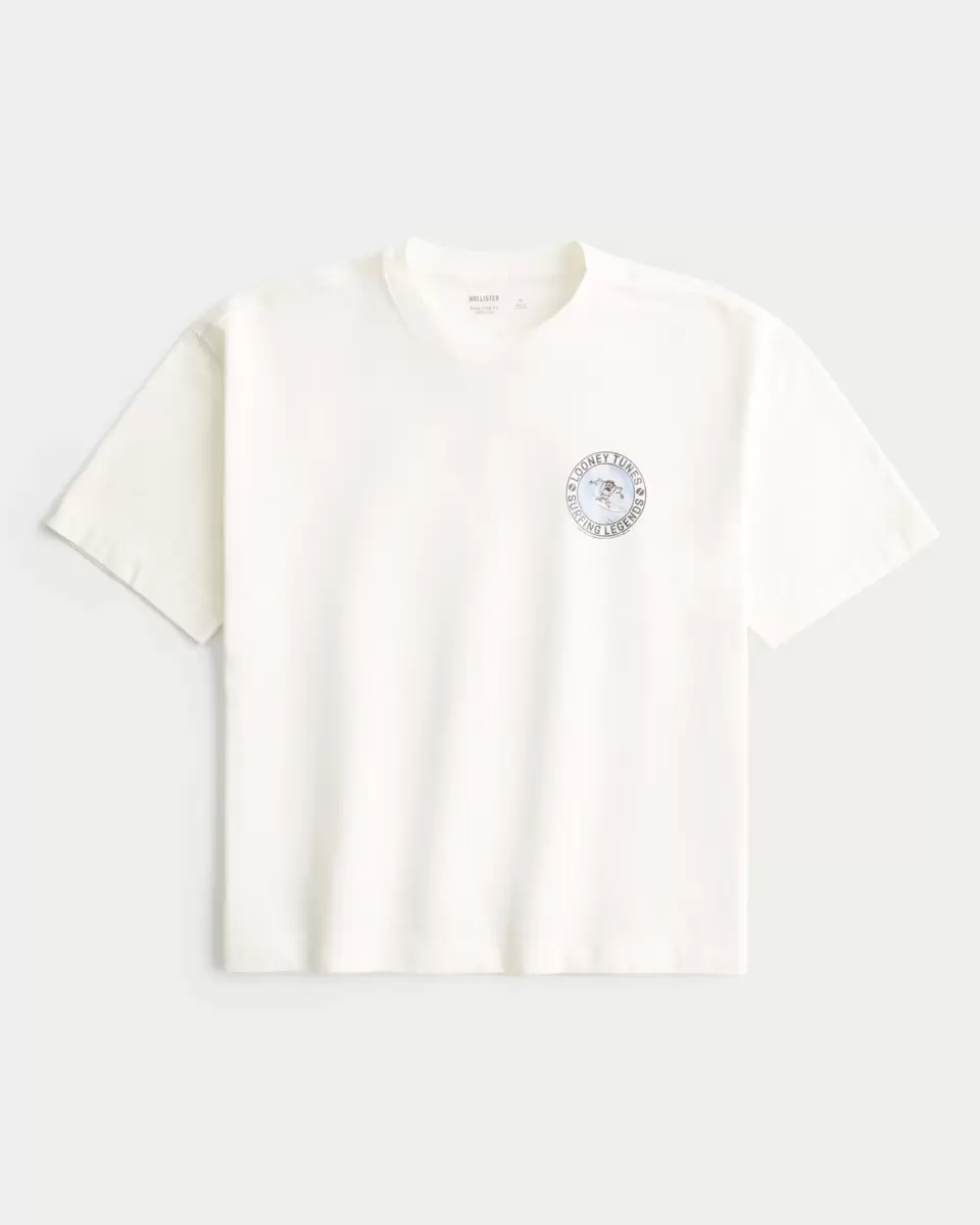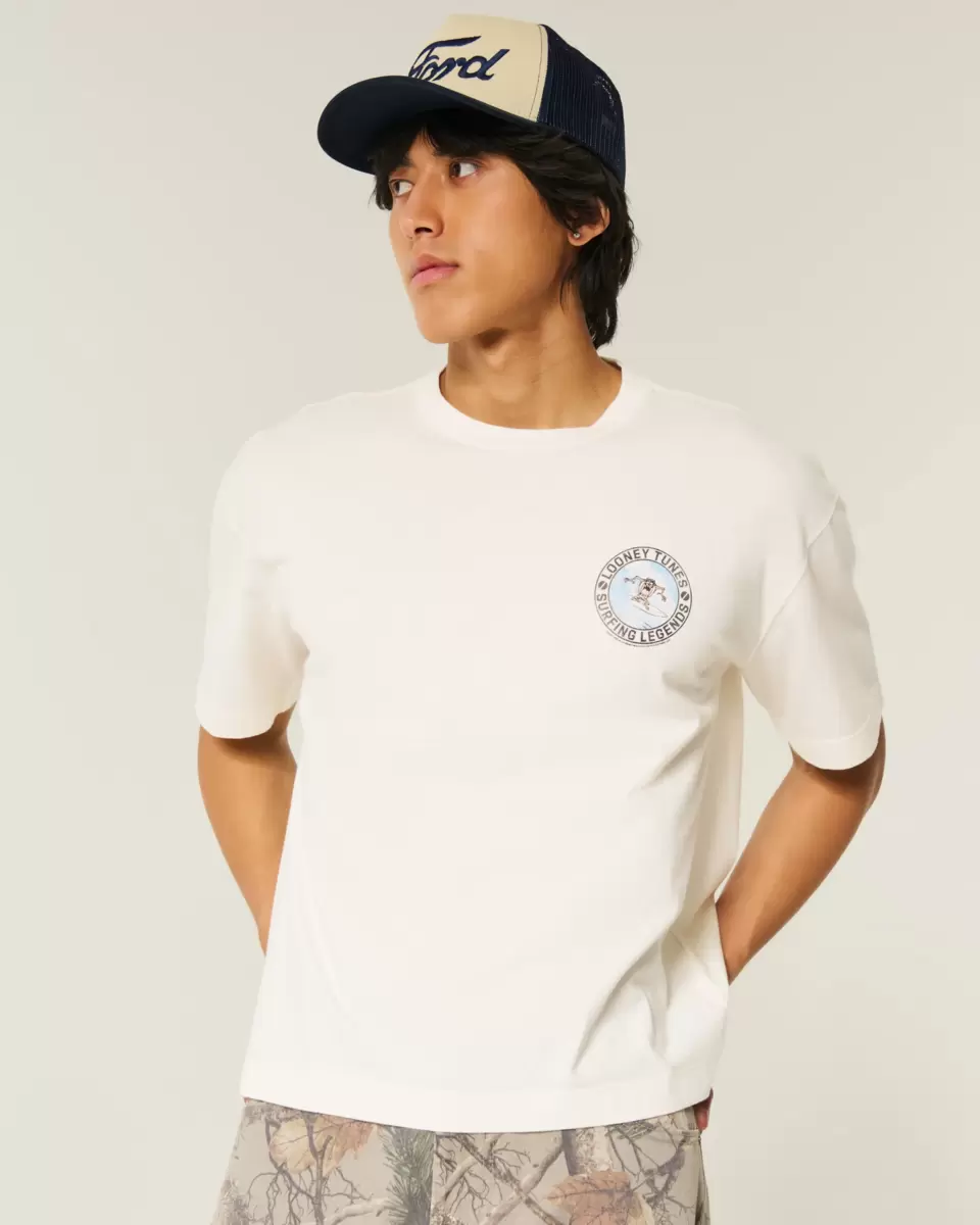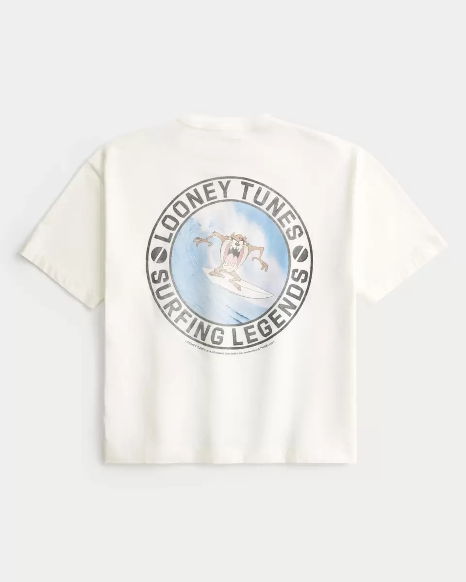 T-shirt ultra doux avec imprimé Taz surf sous licence officielle Looney Tunes sur la poitrine gauche et dans le dos. Encolure ras du cou, manches courtes. Coupe courte et ample. Importé.