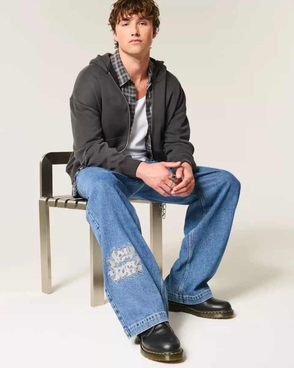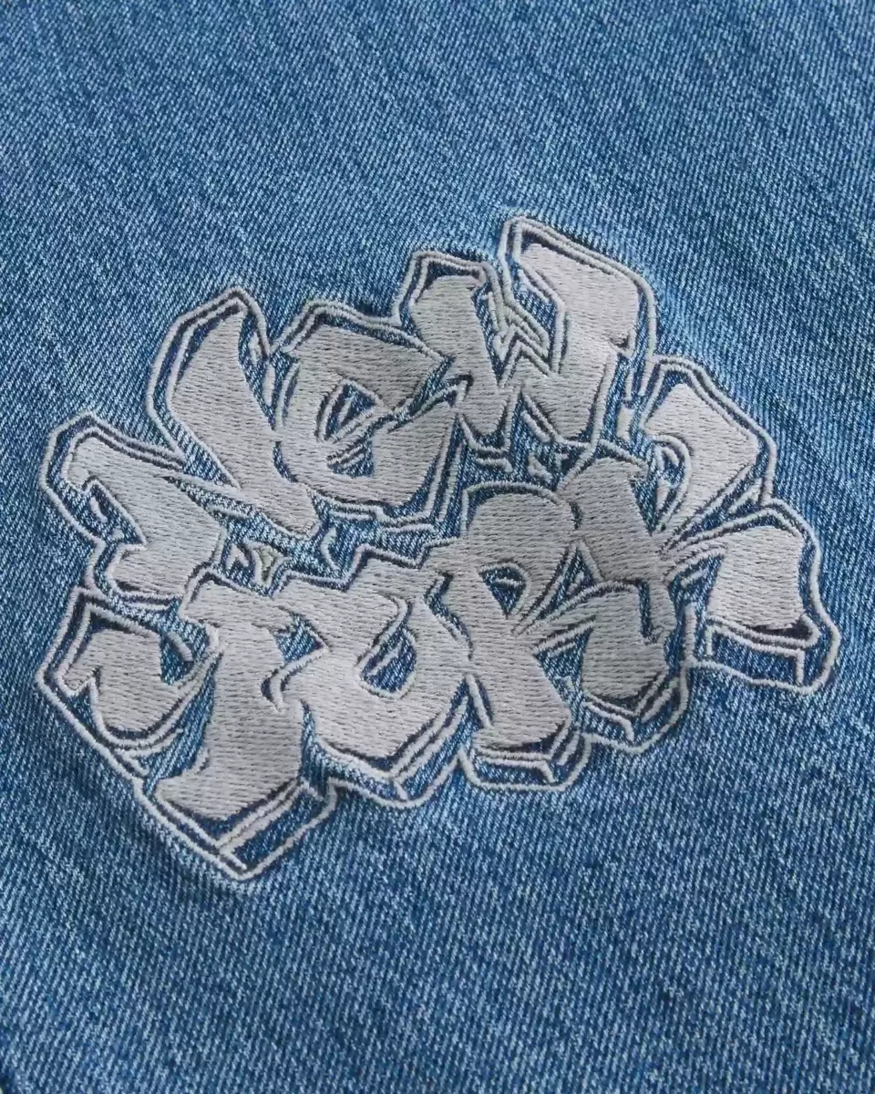 Jean confortable en denim délavé moyen, orné d’une broderie graphique New York sur la jambe droite. Délavage moyen, jambe ultra ample. Importé.