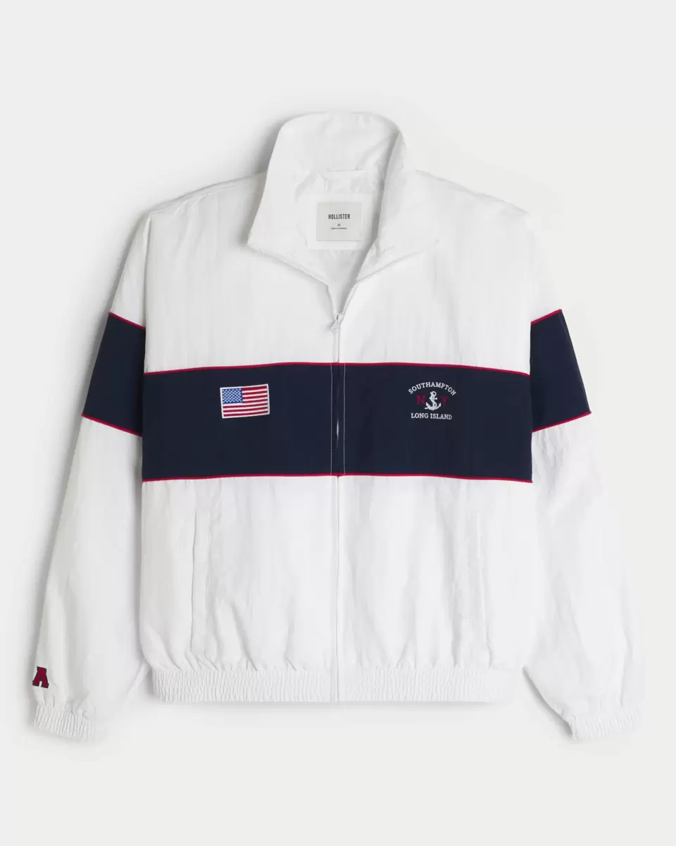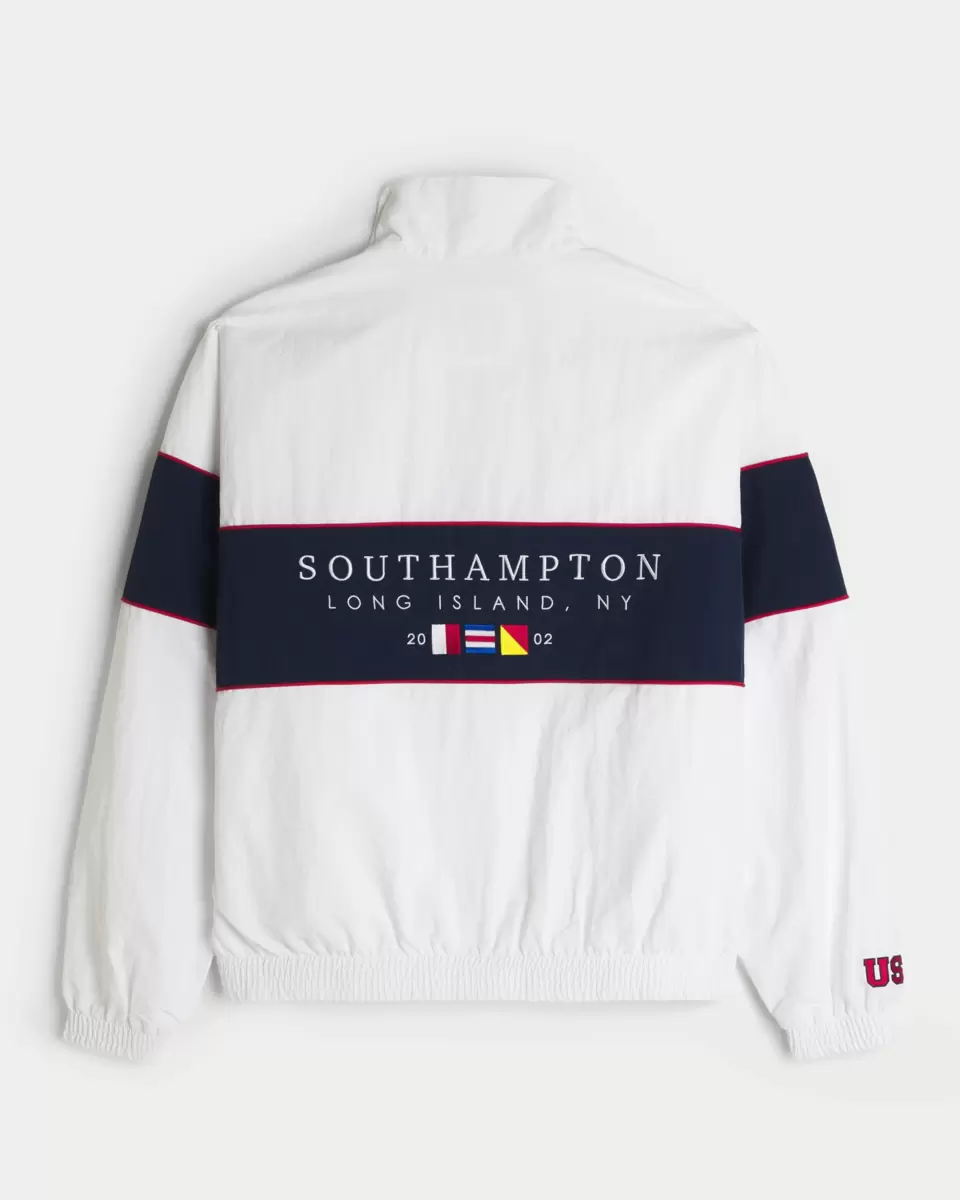 Veste classique avec broderie graphique Southampton Long Island NY sur le devant et le dos. Drapeau américain brodé, poches, ourlets à bandes, col montant et fermeture éclair intégrale.