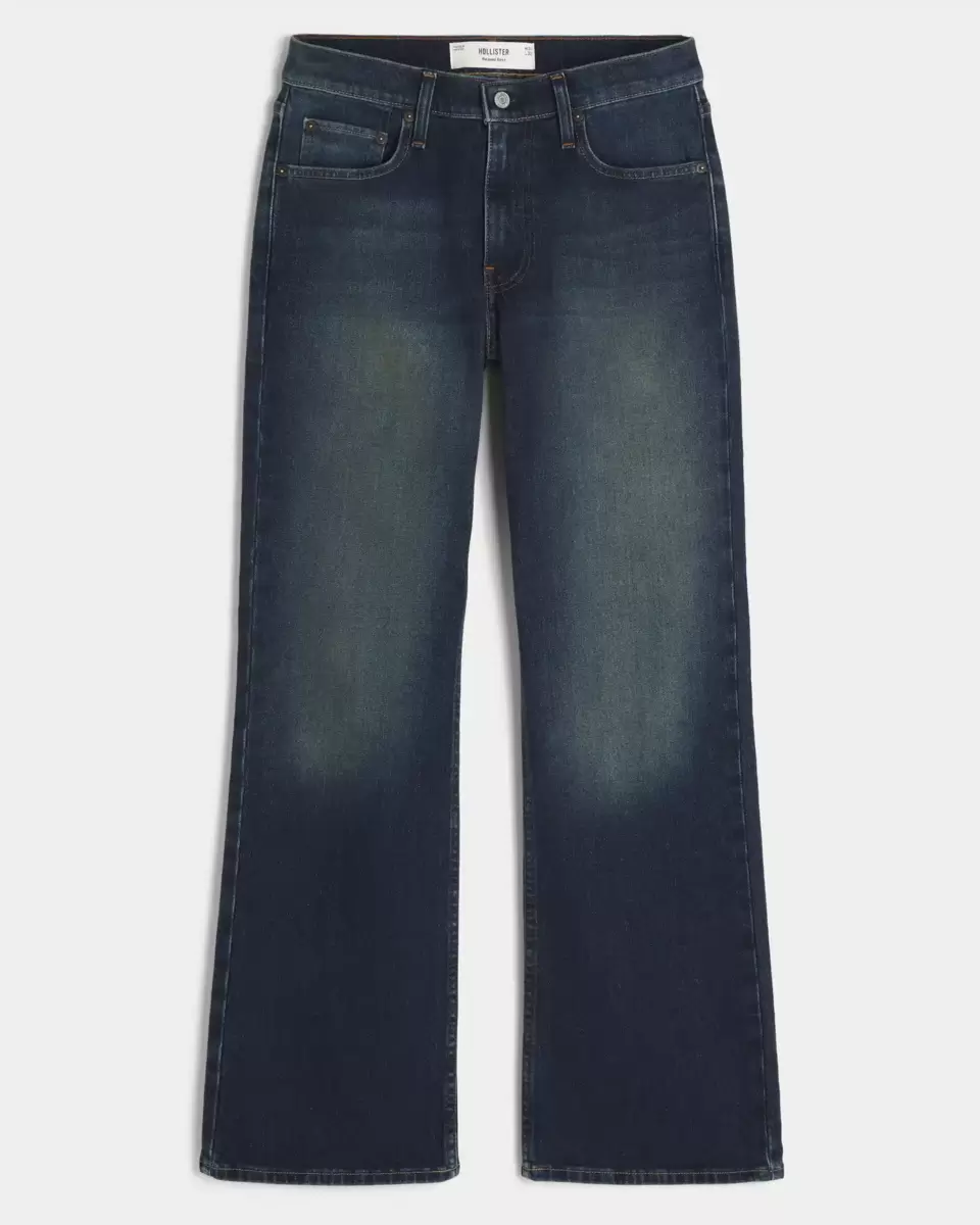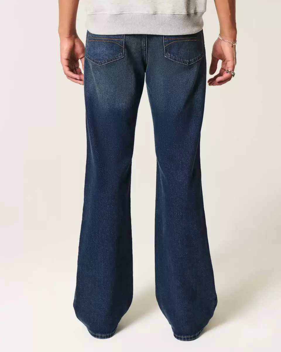 Jean confortable en denim foncé, coupe décontractée et ouverture bottillon. Décoloration et effet moustaches. Importé.