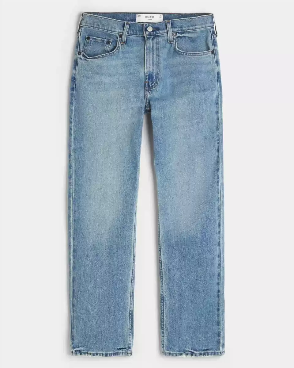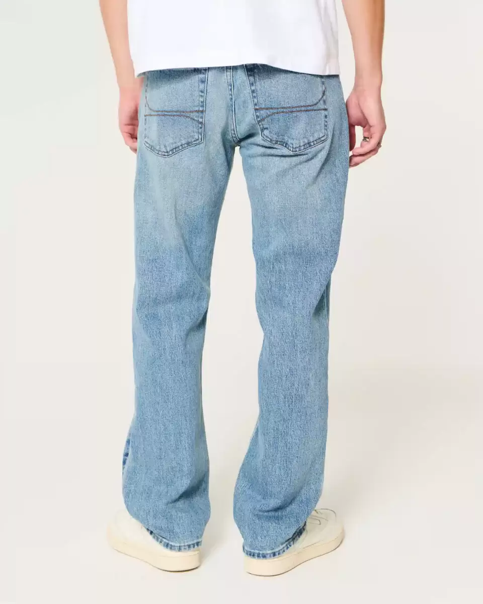 Jean ultra-confortable en denim extensible vintage, délavage moyen, coupe droite. Décoloration et effet moustaches. Importé.