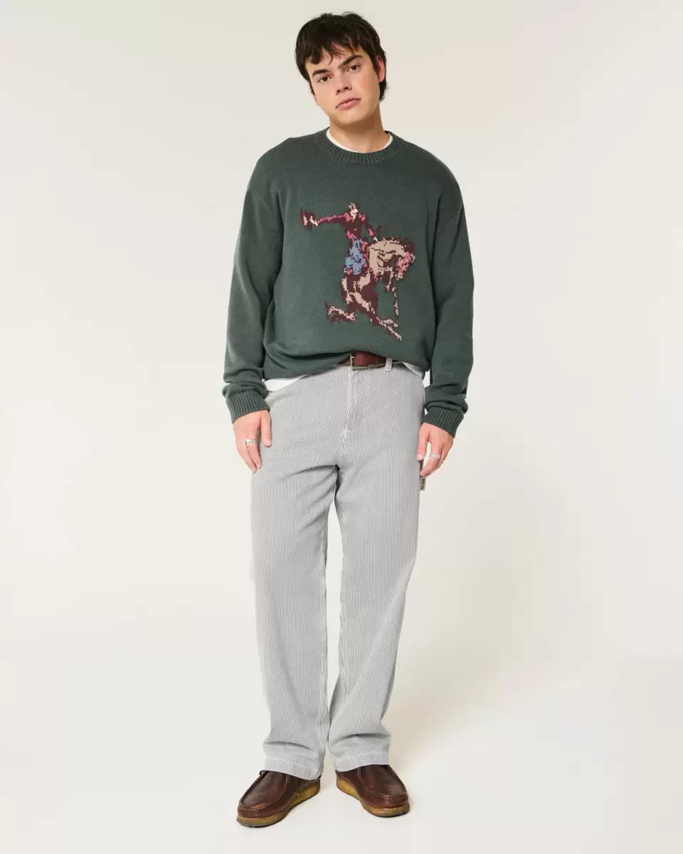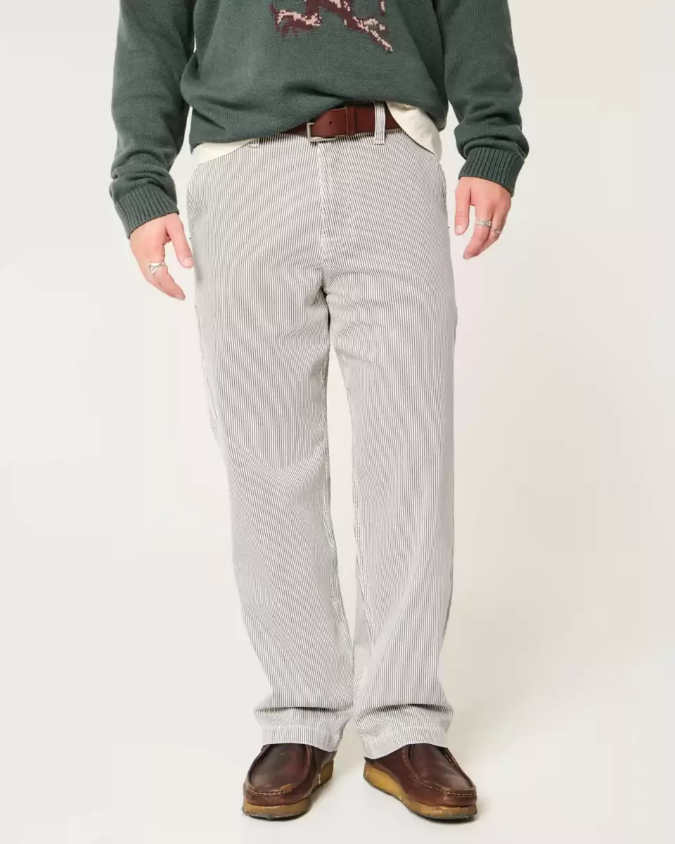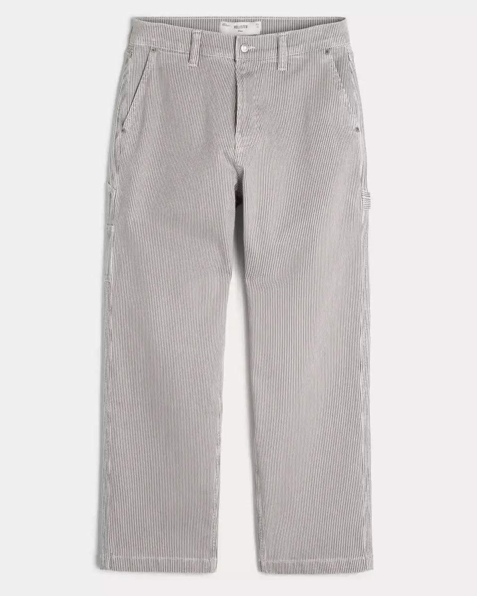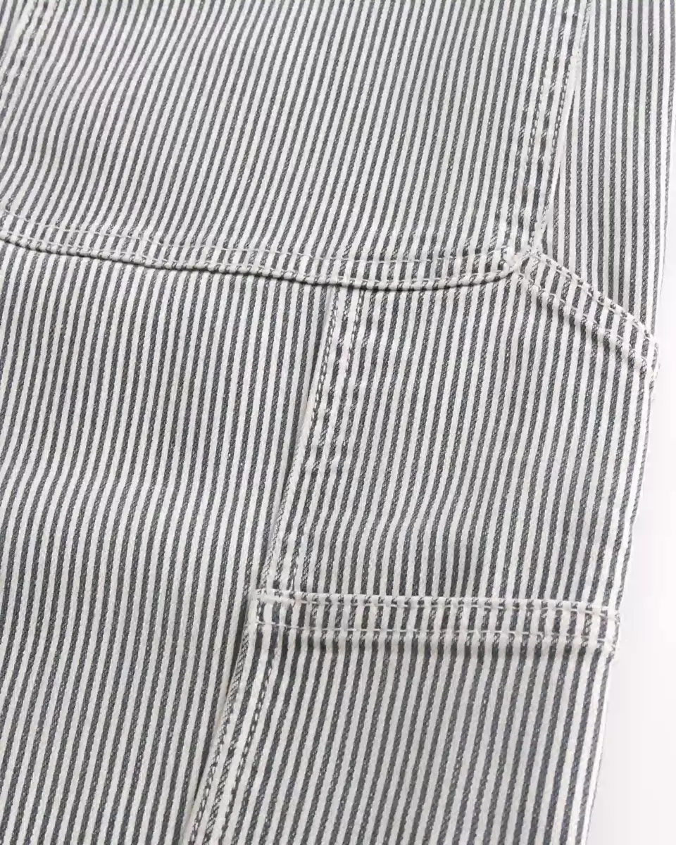 Jean en denim ultra-confortable style peintre, coupe ample. Motif à rayures classiques, boucle à gauche, poches supplémentaires. Importé.