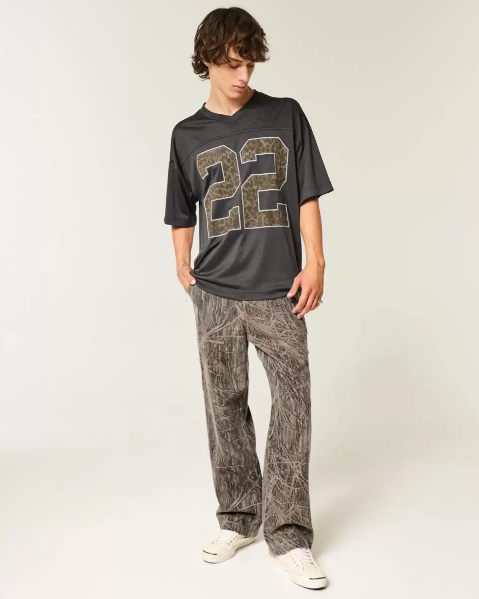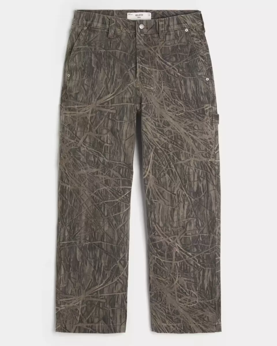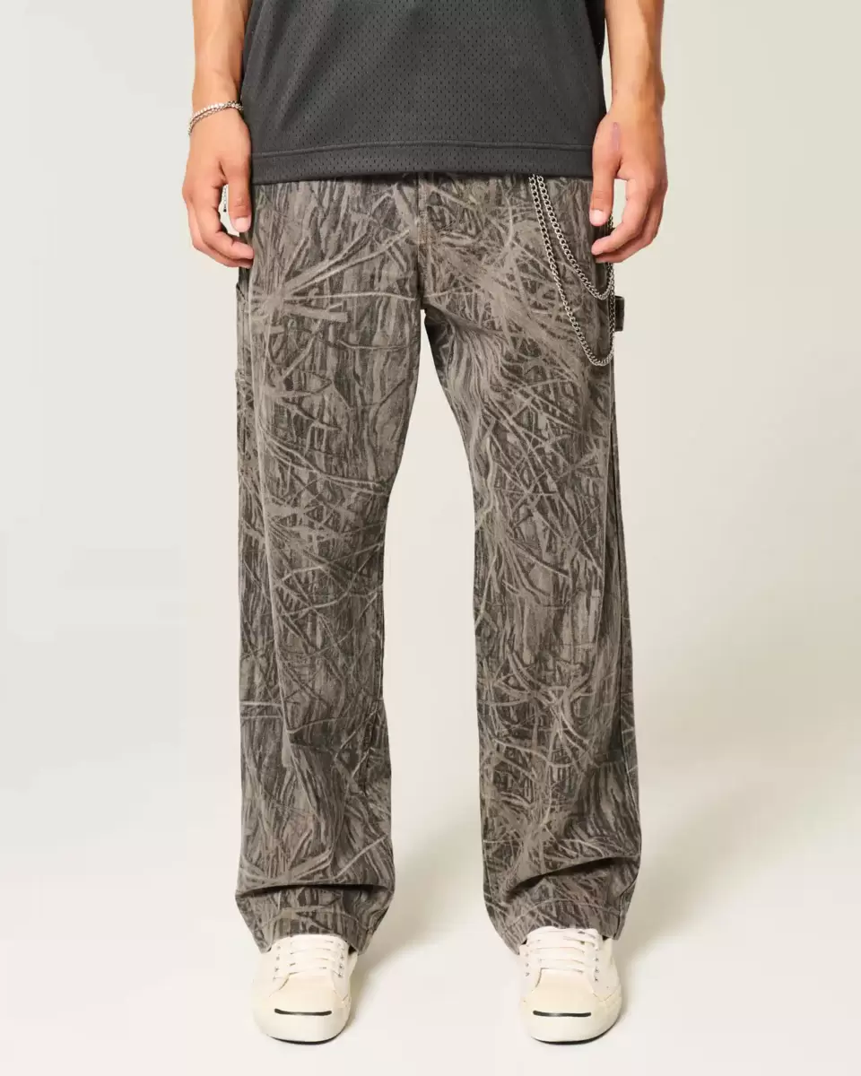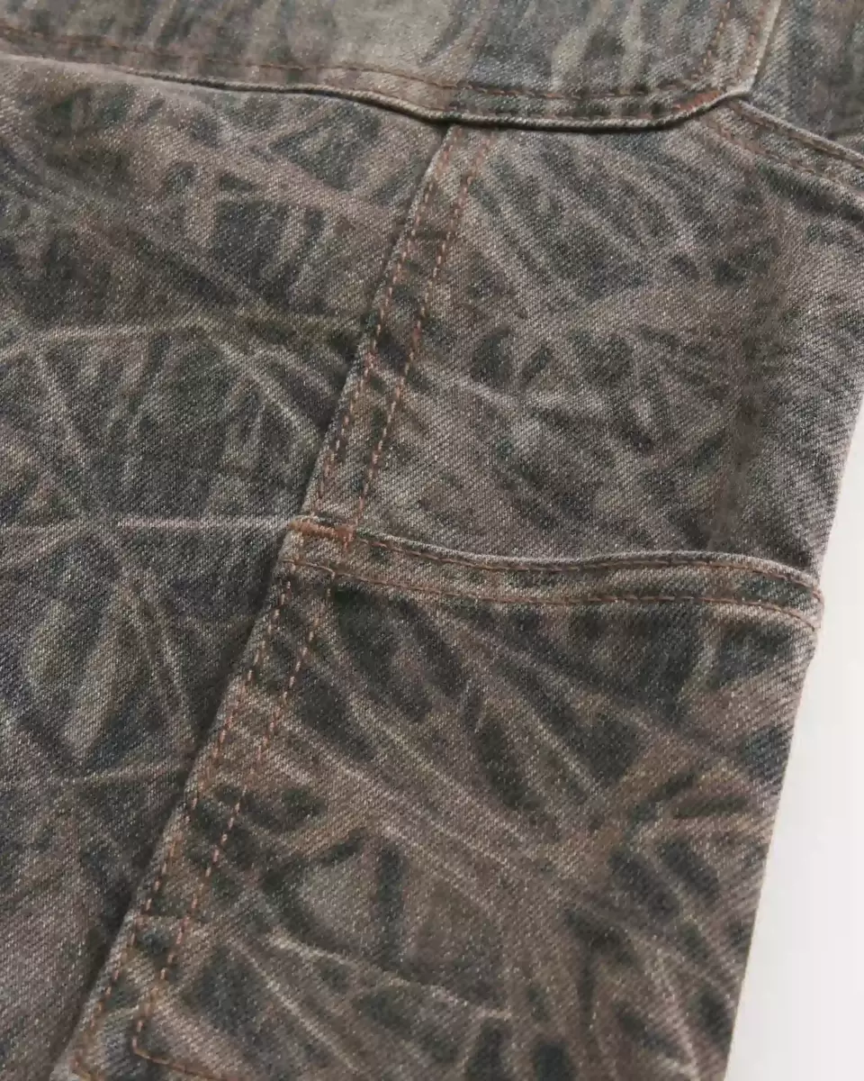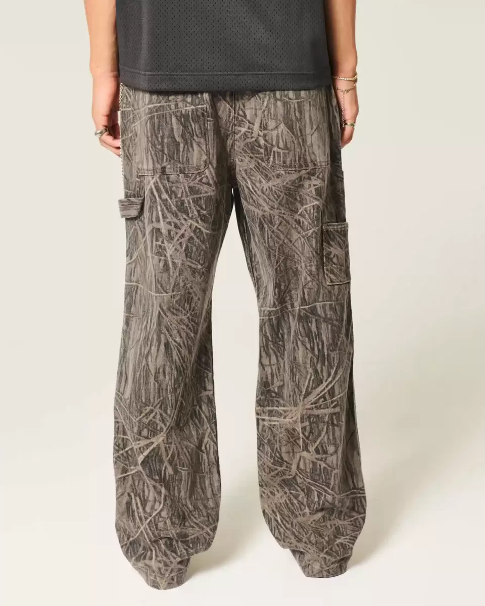 Jean en denim confortable avec jambe ample, passant à gauche et poches supplémentaires. Motif camouflage intégral.