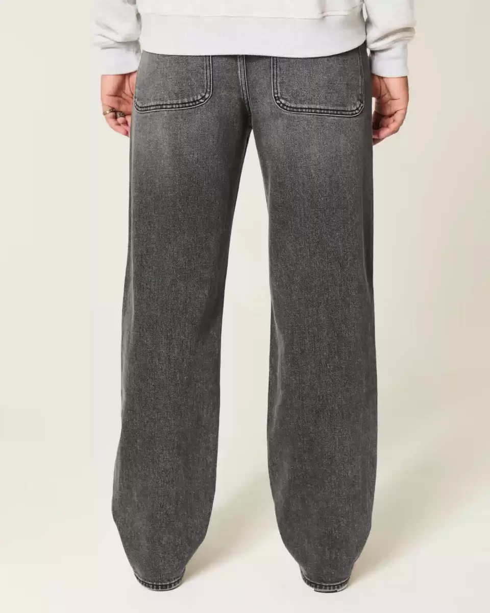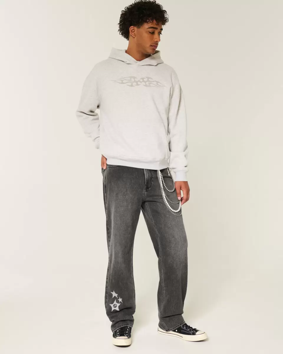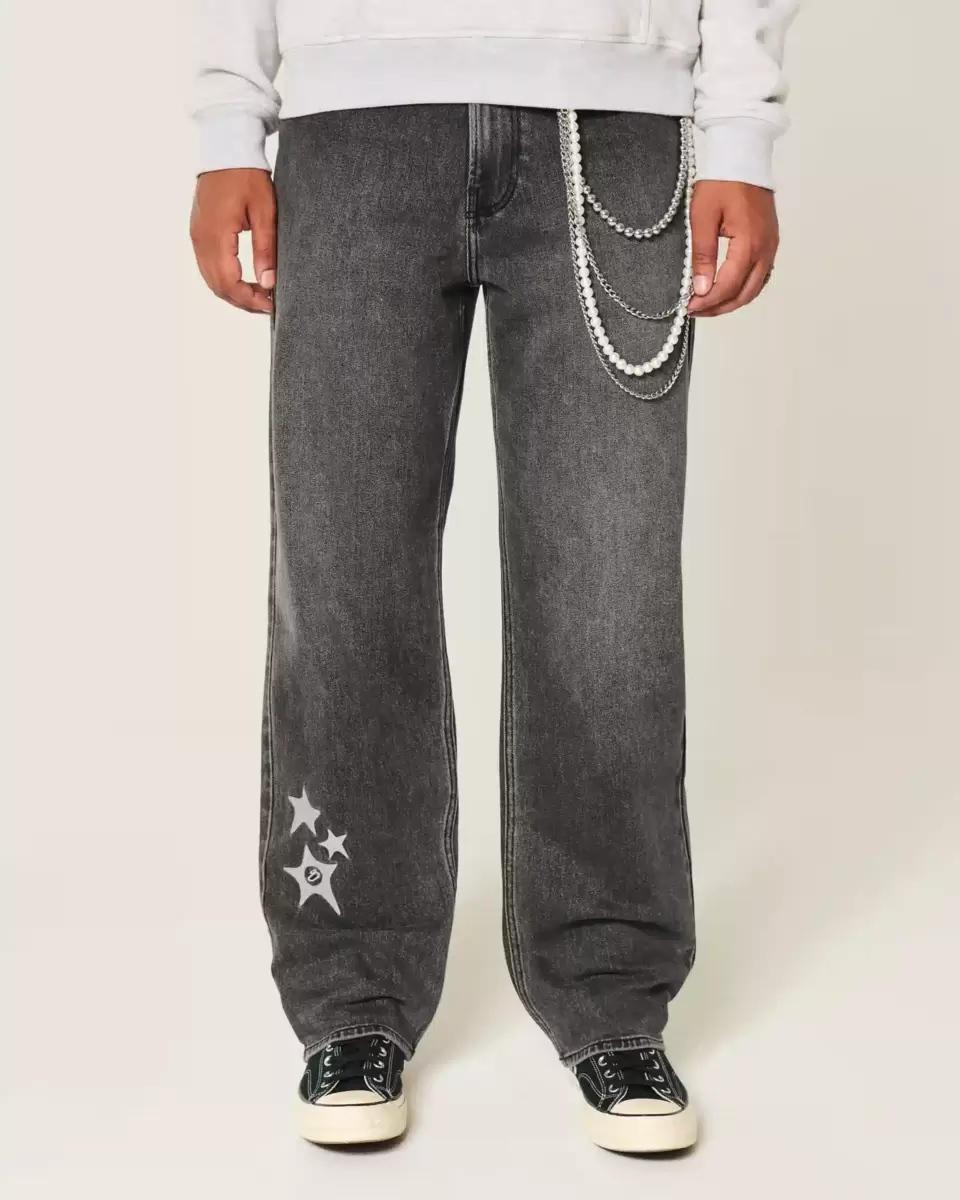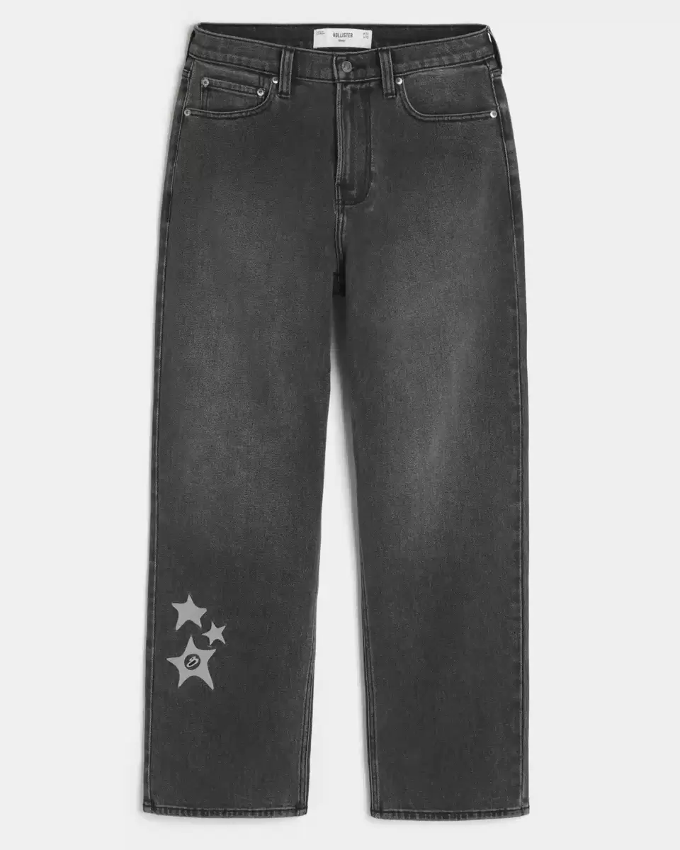 Jean confortable en denim noir délavé, coupe ample. Broderie étoile sur la jambe droite, effet délavé. Importé.
