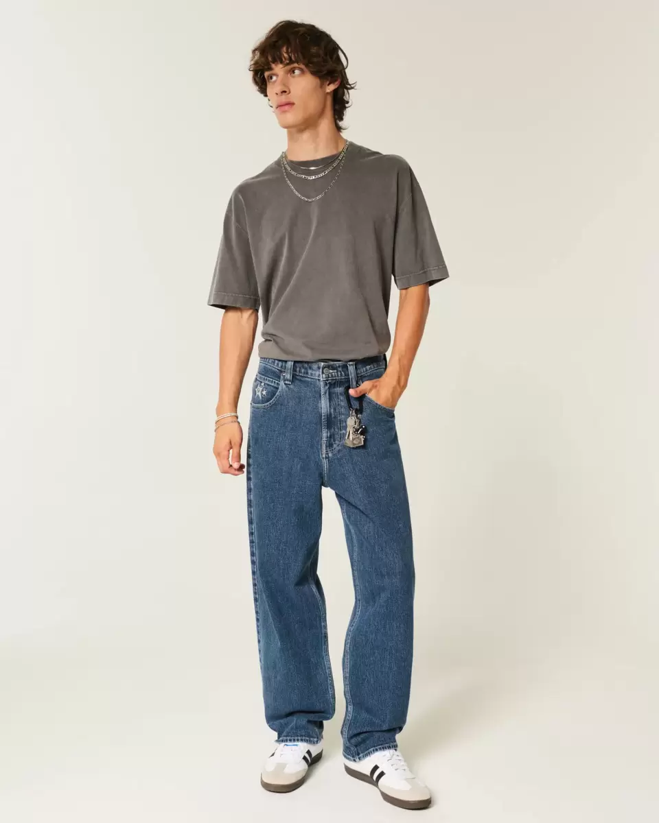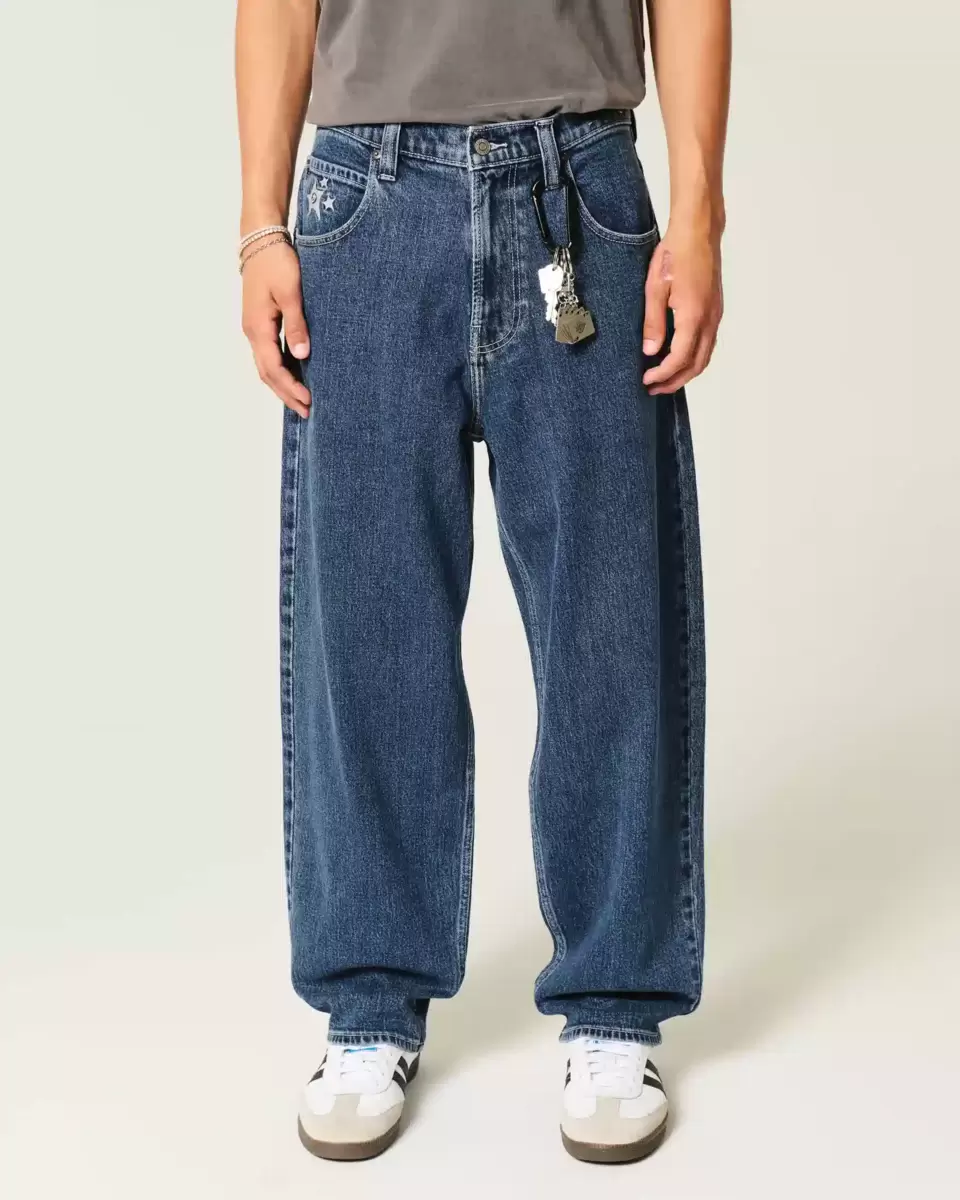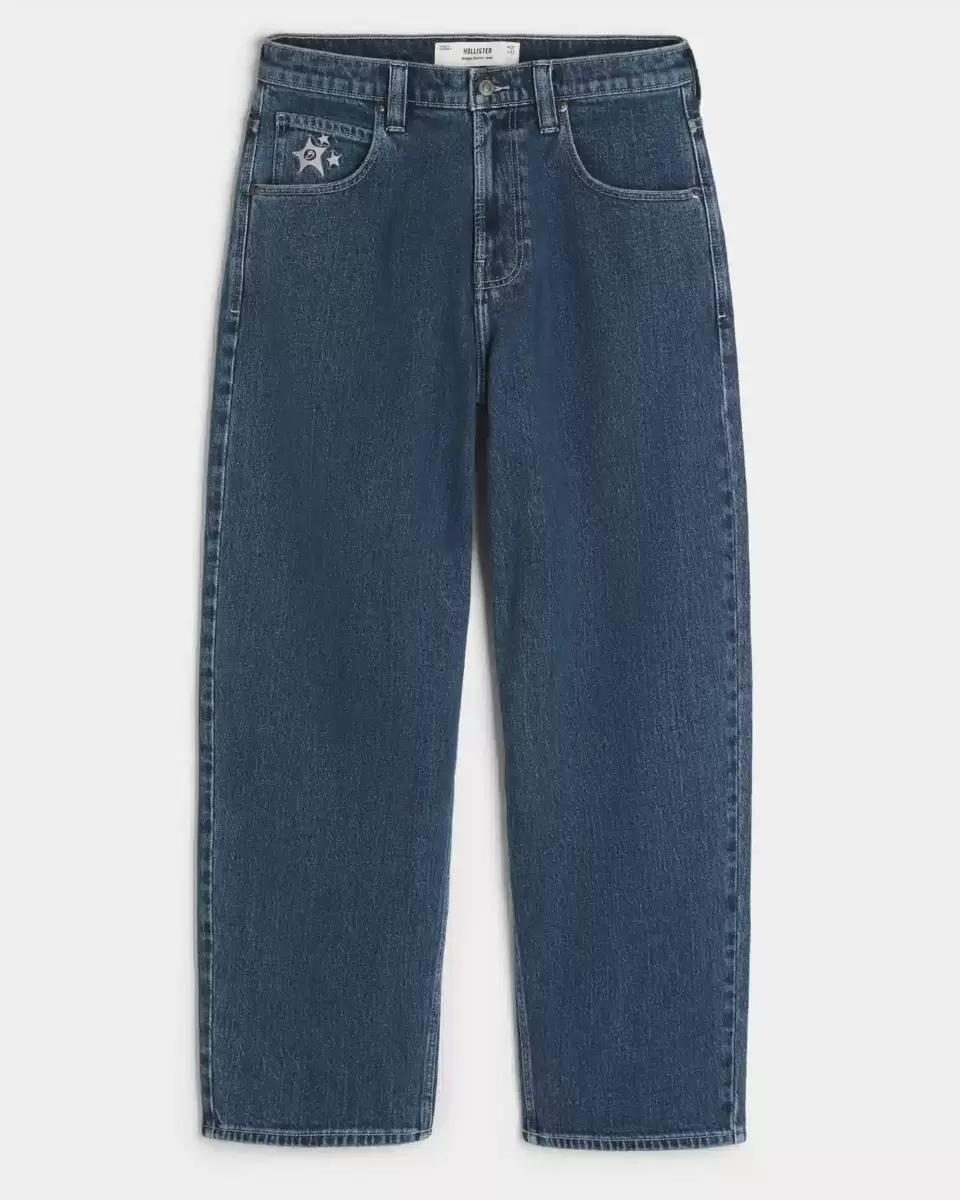 Jean skater confortable en denim, coupe ample. Délavage moyen, coupe classique à 5 poches, motif étoile brodé sur la poche monnaie droite. Importé.