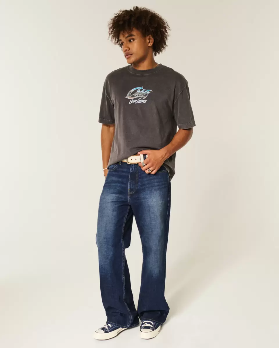 Jean confortable en denim délavé foncé, avec jambe ample et ouverture bootcut. Décoloration, effet moustaches, style emblématique à 5 poches. Importé.