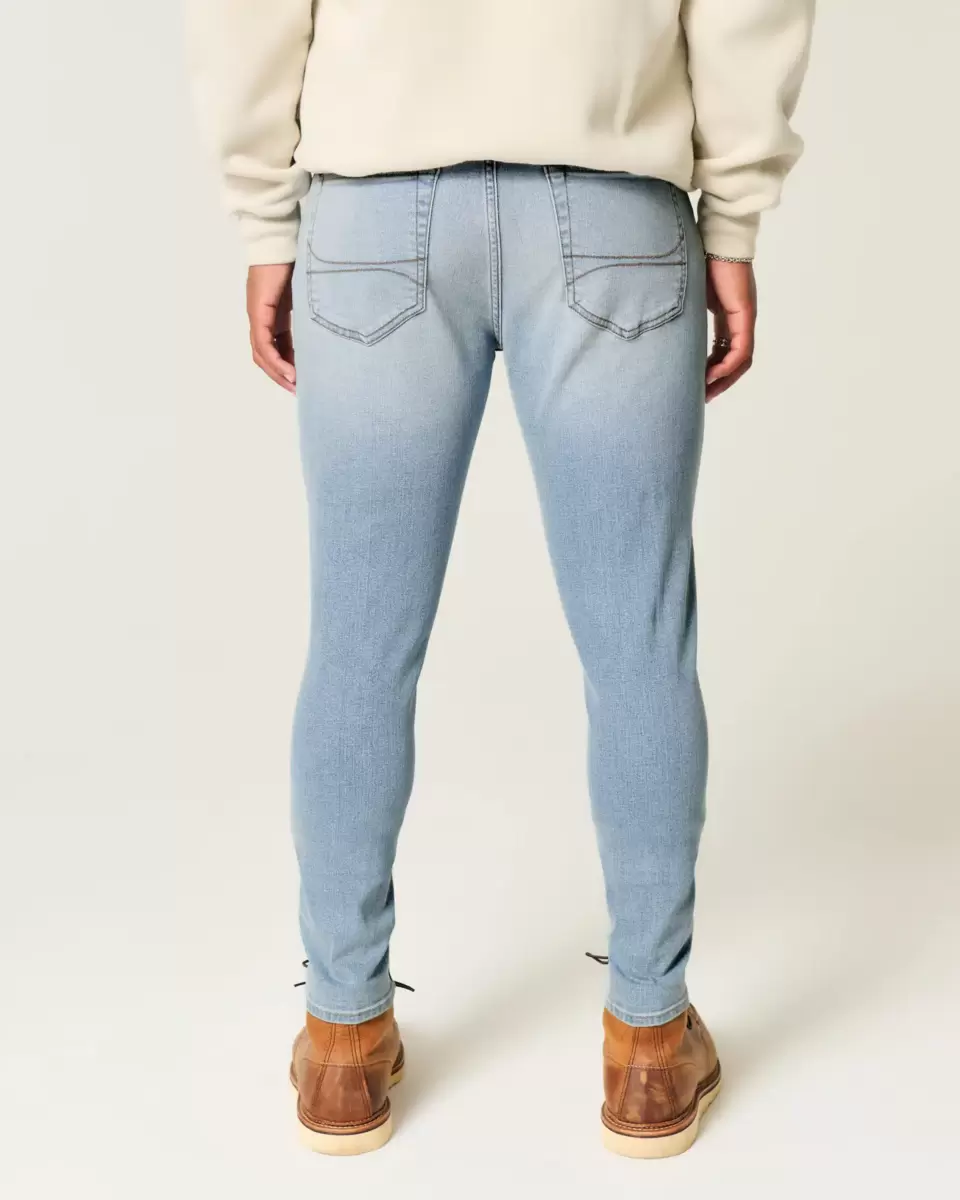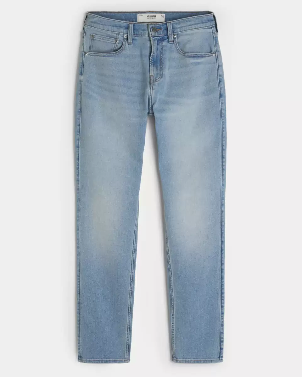 Jean délavé clair, coupe skinny, plus ample au niveau des cuisses. Décoloration et effet moustaches. Importé.