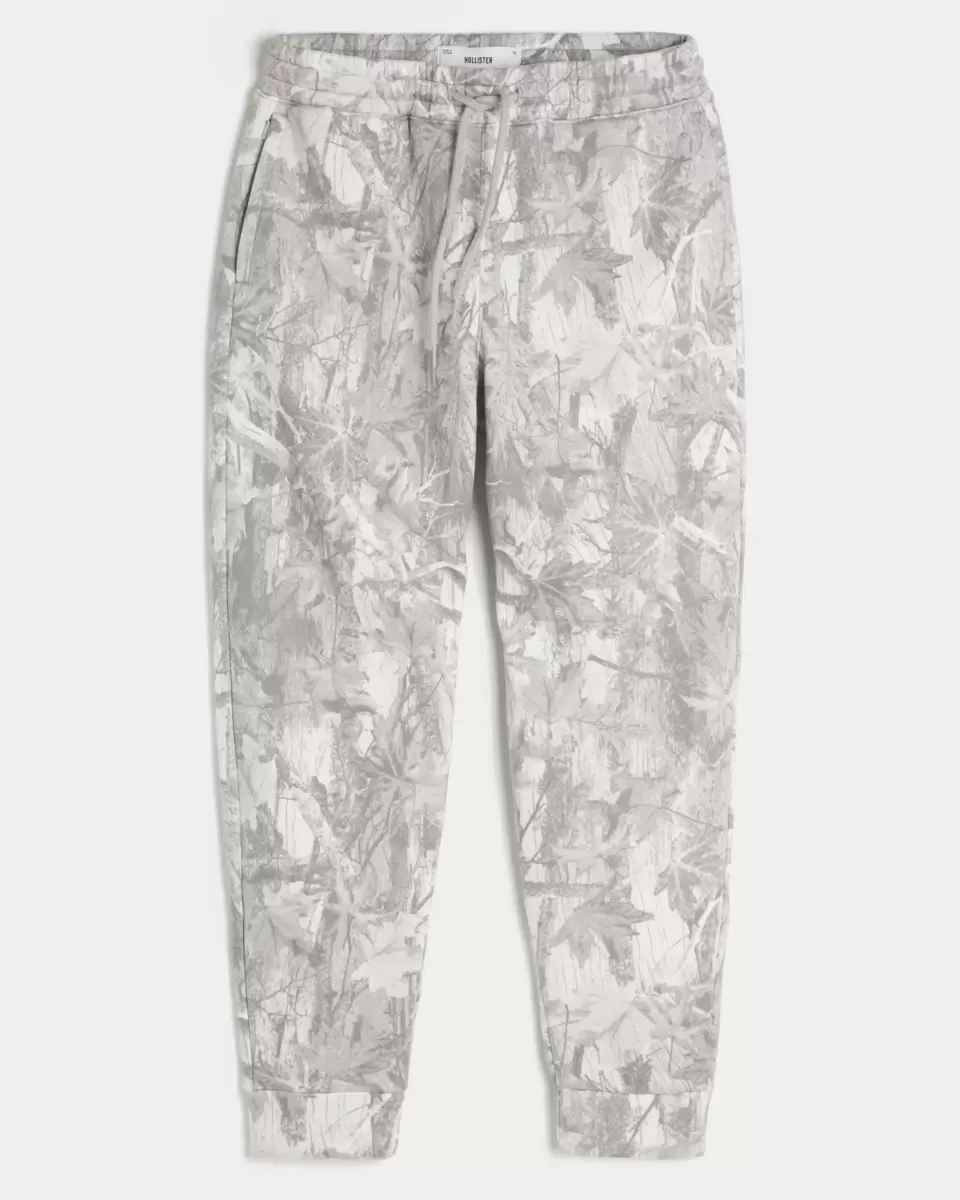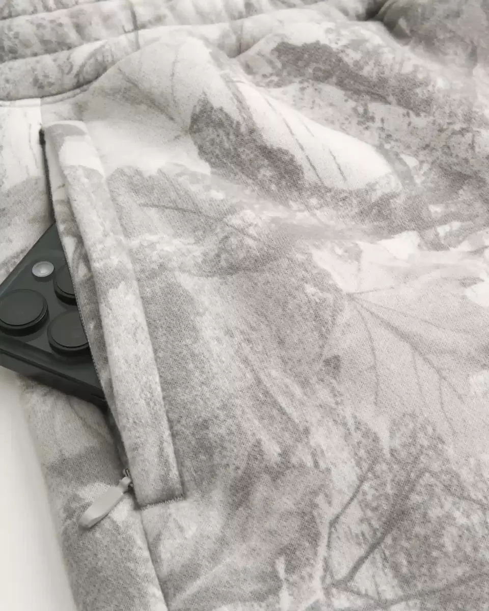Pantalon de jogging en polaire ultra doux avec cordon de serrage à la taille, ourlet à bande et motif camouflage intégral. Poches, poche droite zippée. Importé.