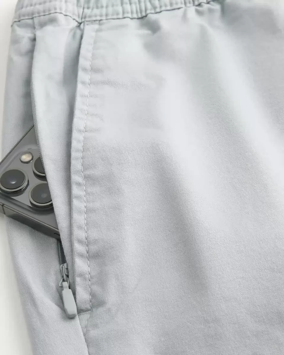 Short ultra-confortable en sergé, doté d’un cordon de serrage à la taille et d’une coupe au-dessus du genou. Poches, dont une poche droite zippée. Importé.