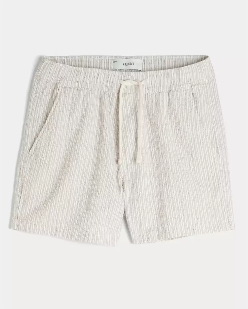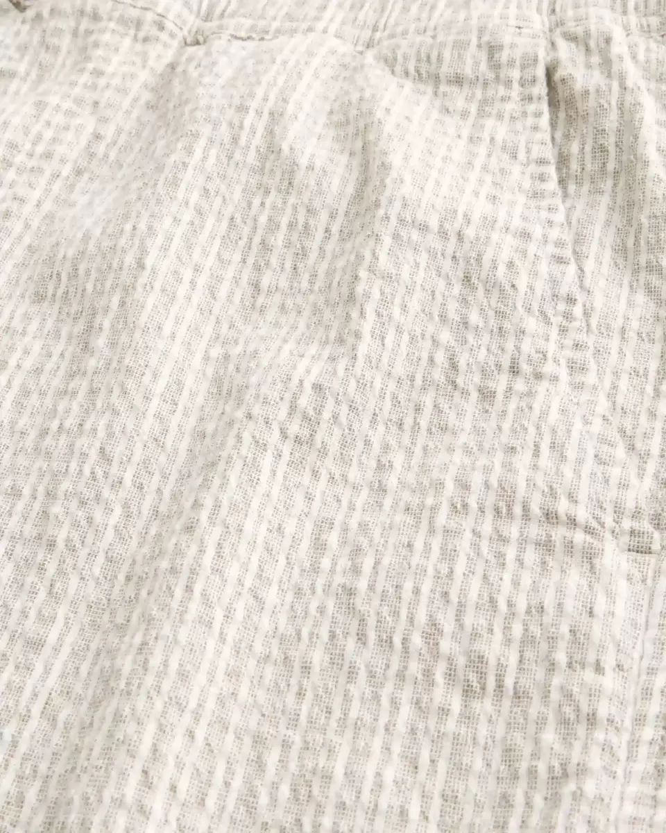 Short confortable en mélange de lin doux, longueur mi-cuisse et taille à cordon. Poches, tissu seersucker classique. Importé.