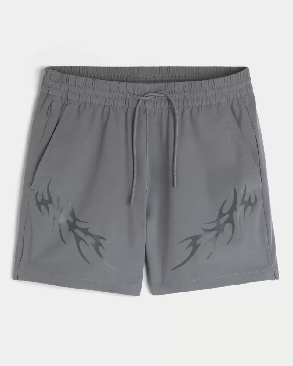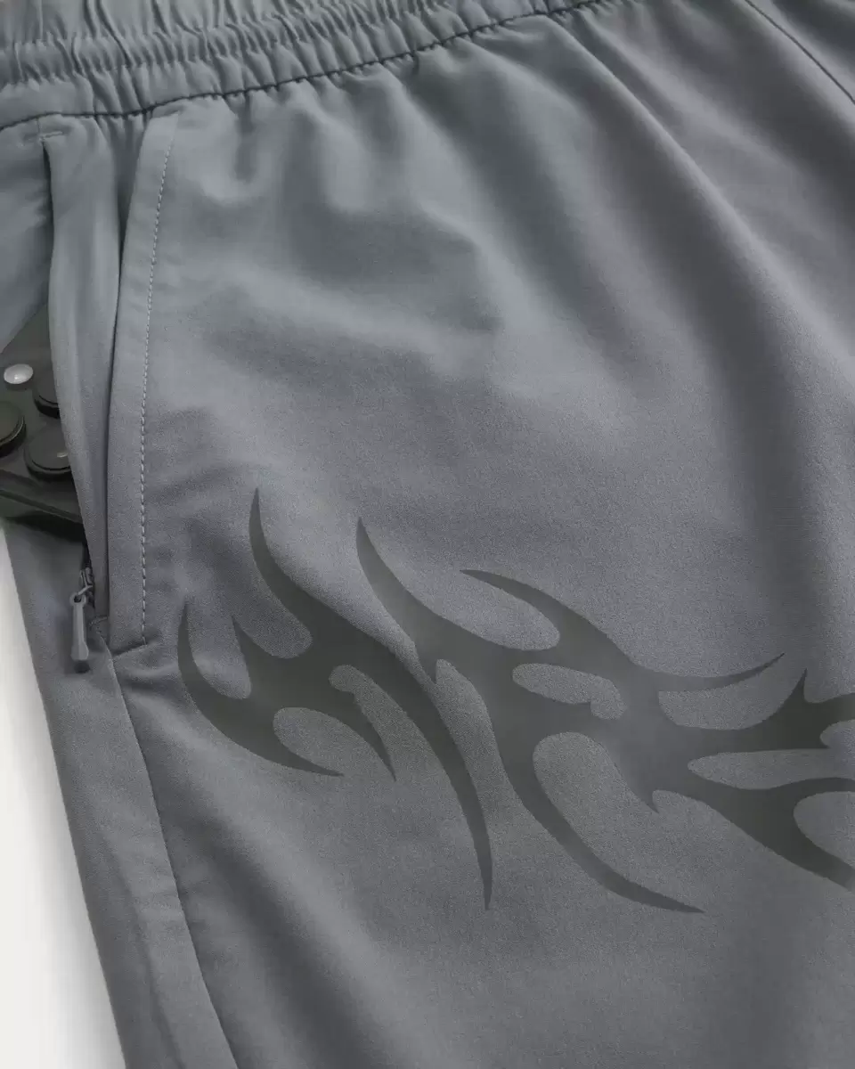 Short de sport confortable et extensible, longueur mi-cuisse et taille à cordon de serrage. Motifs, poche droite zippée, poches. Importé.