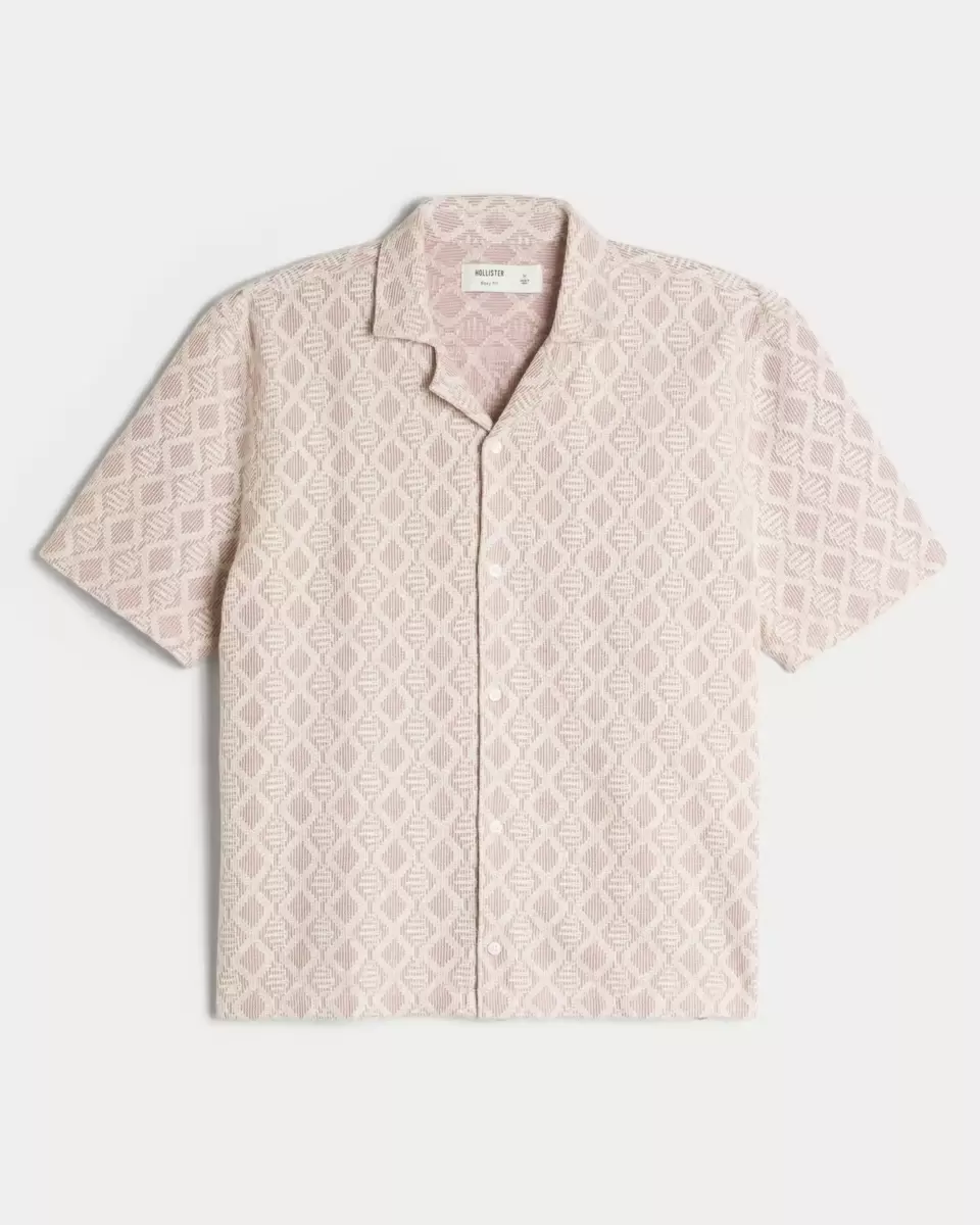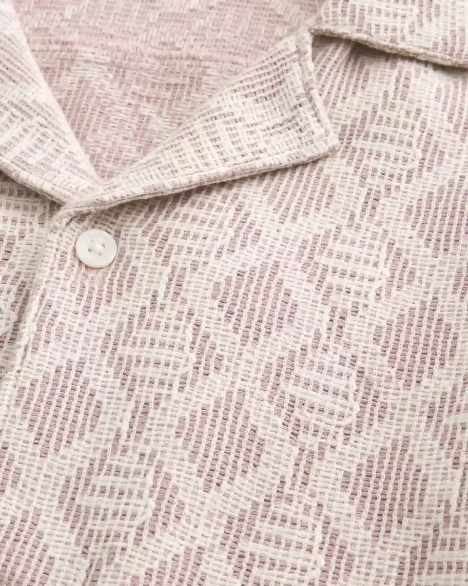 Confectionnée dans un tissu doux façon crochet, cette chemise boutonnée classique arbore un motif losanges sur toute la surface et des manches courtes. Fermeture boutonnée, col et coupe carrée.