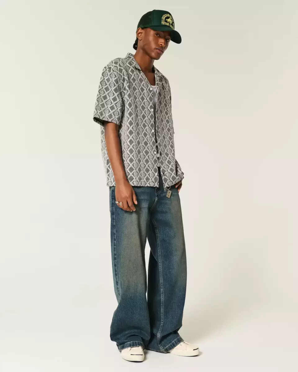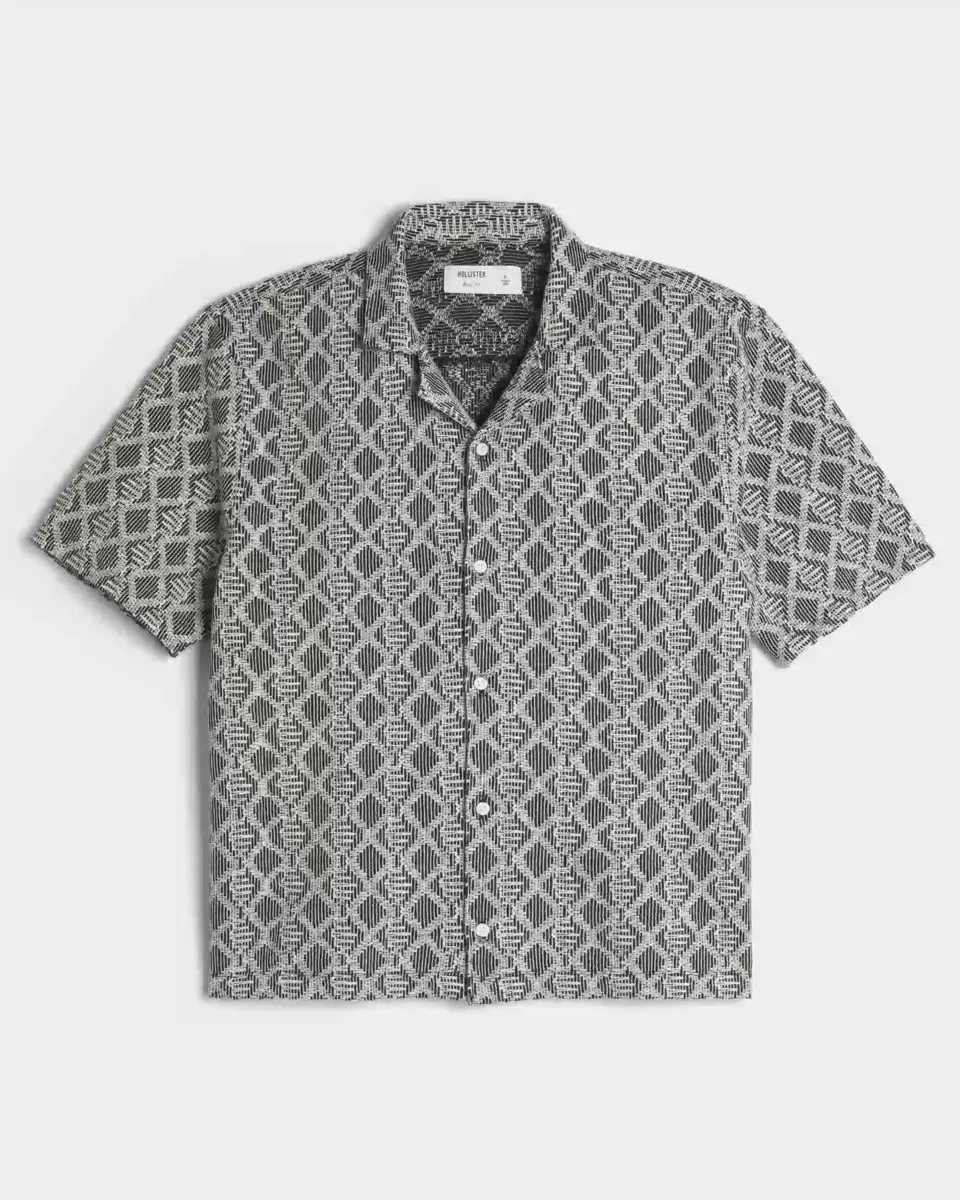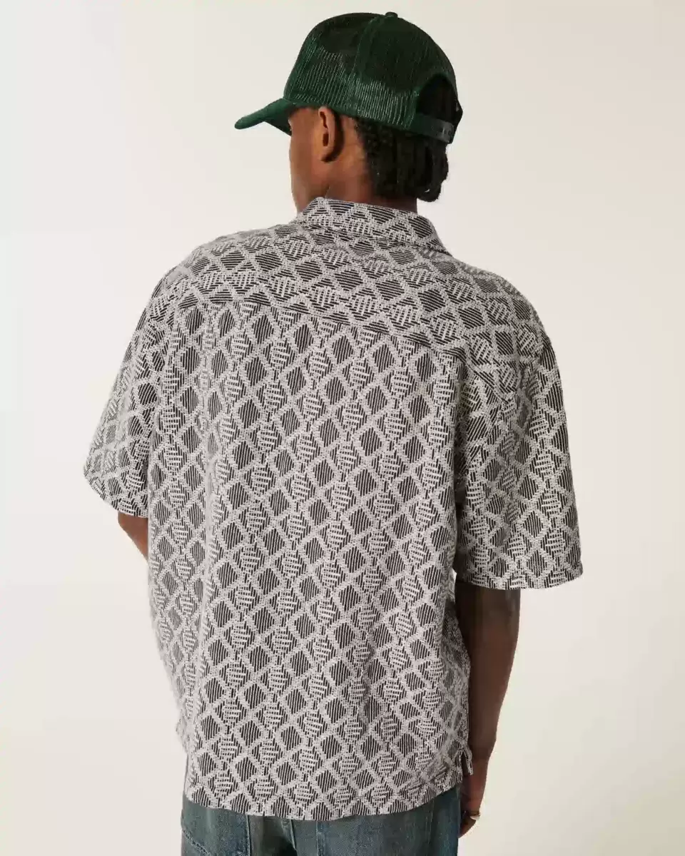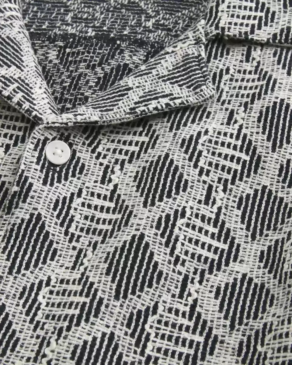 Confectionnée dans un tissu doux façon crochet, cette chemise boutonnée classique présente un motif losanges sur toute la surface et des manches courtes. Fermeture boutonnée, col et coupe carrée. Importée.
