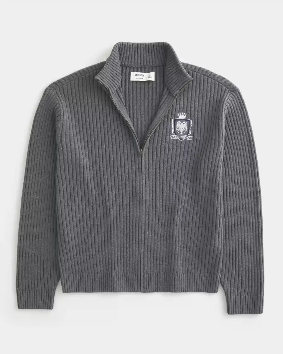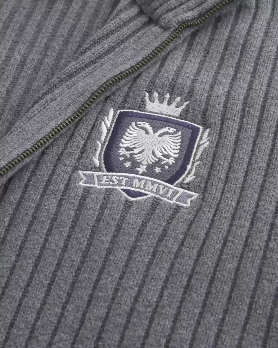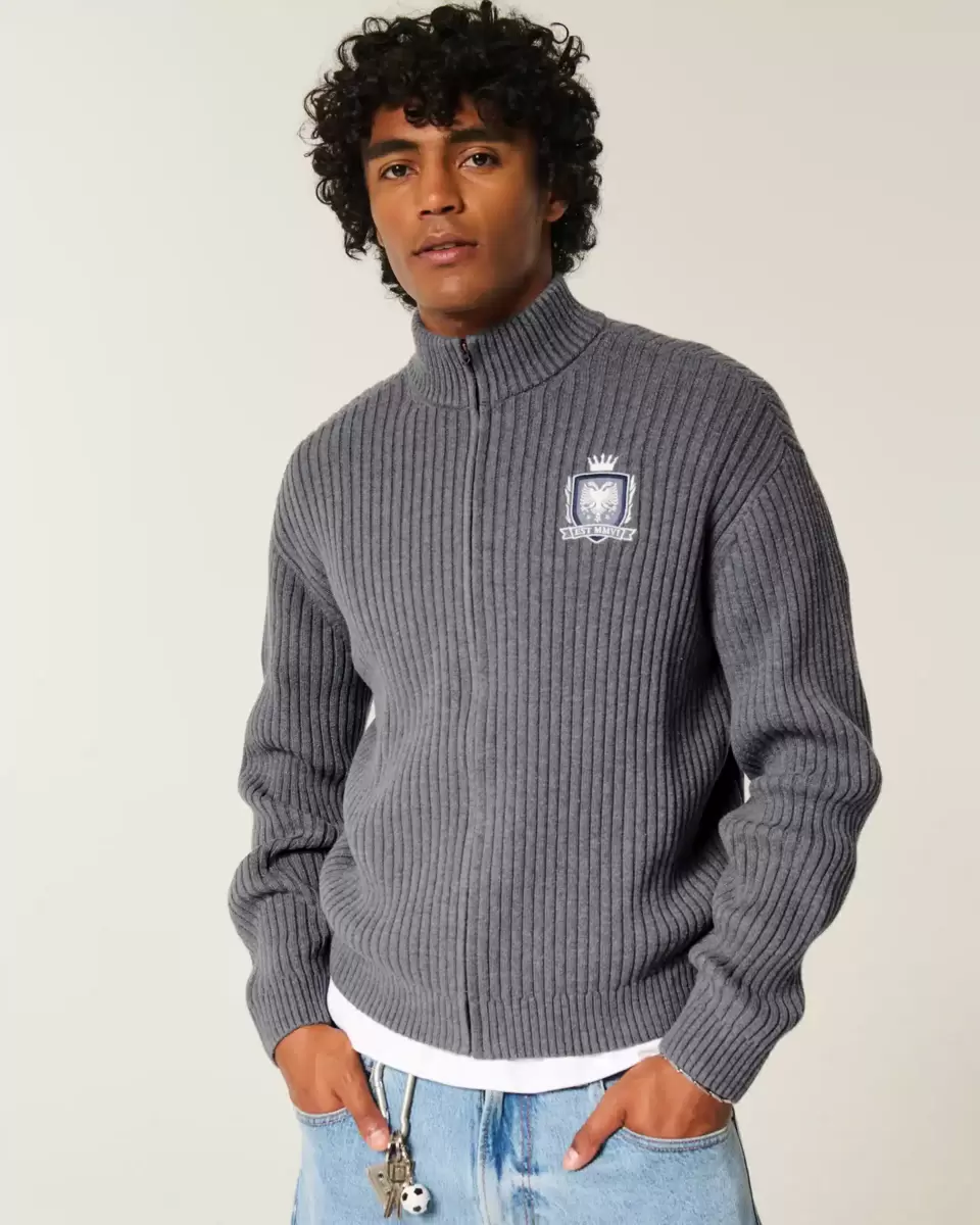 Ce pull ultra doux présente un col montant, une fermeture éclair intégrale et une broderie graphique sur le côté gauche de la poitrine. Bordures côtelées, manches longues. Coupe décontractée. Importé.