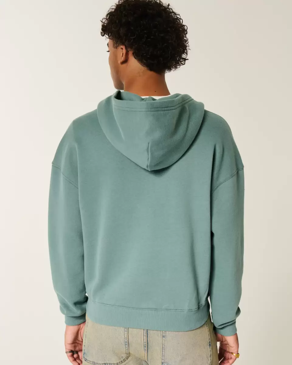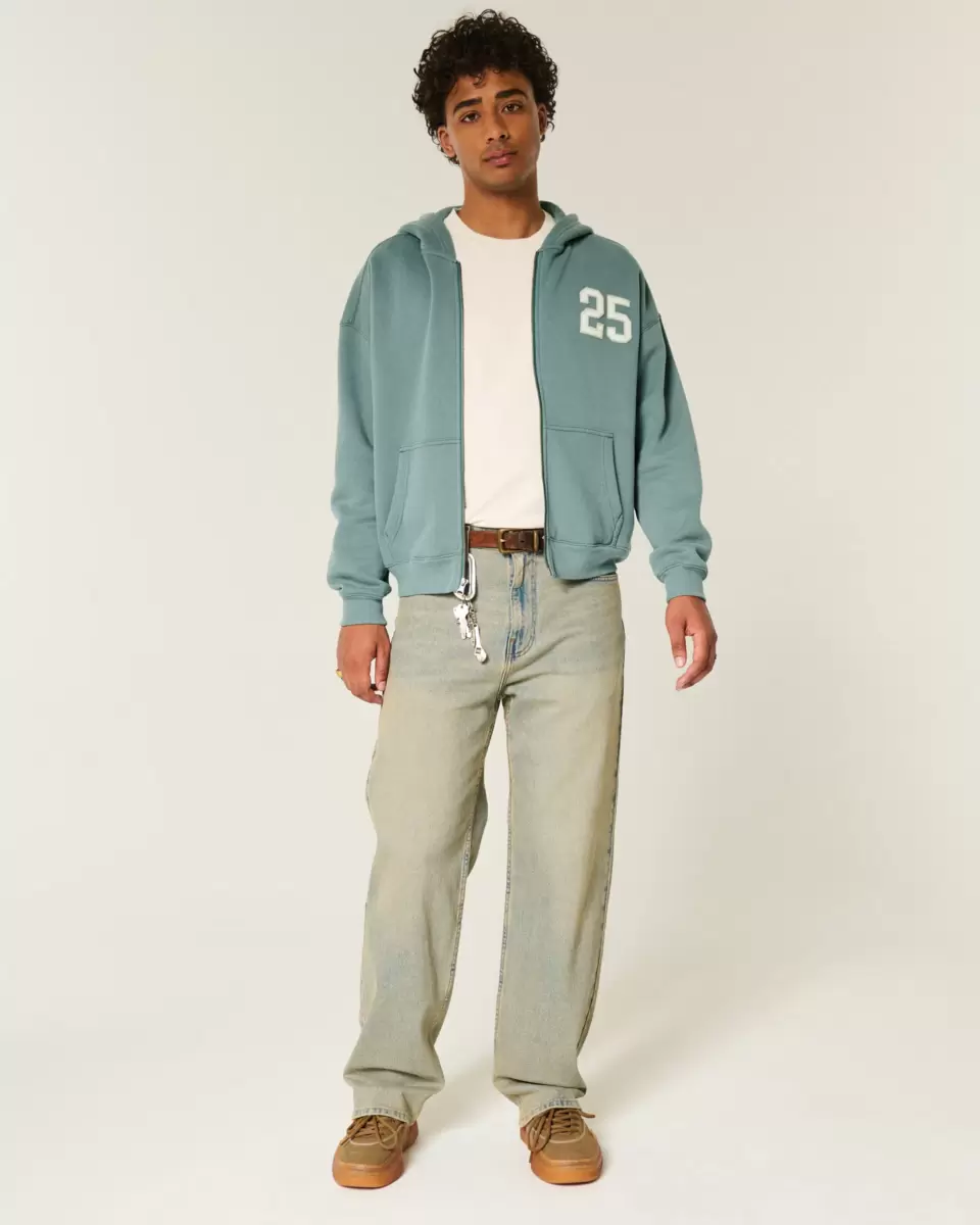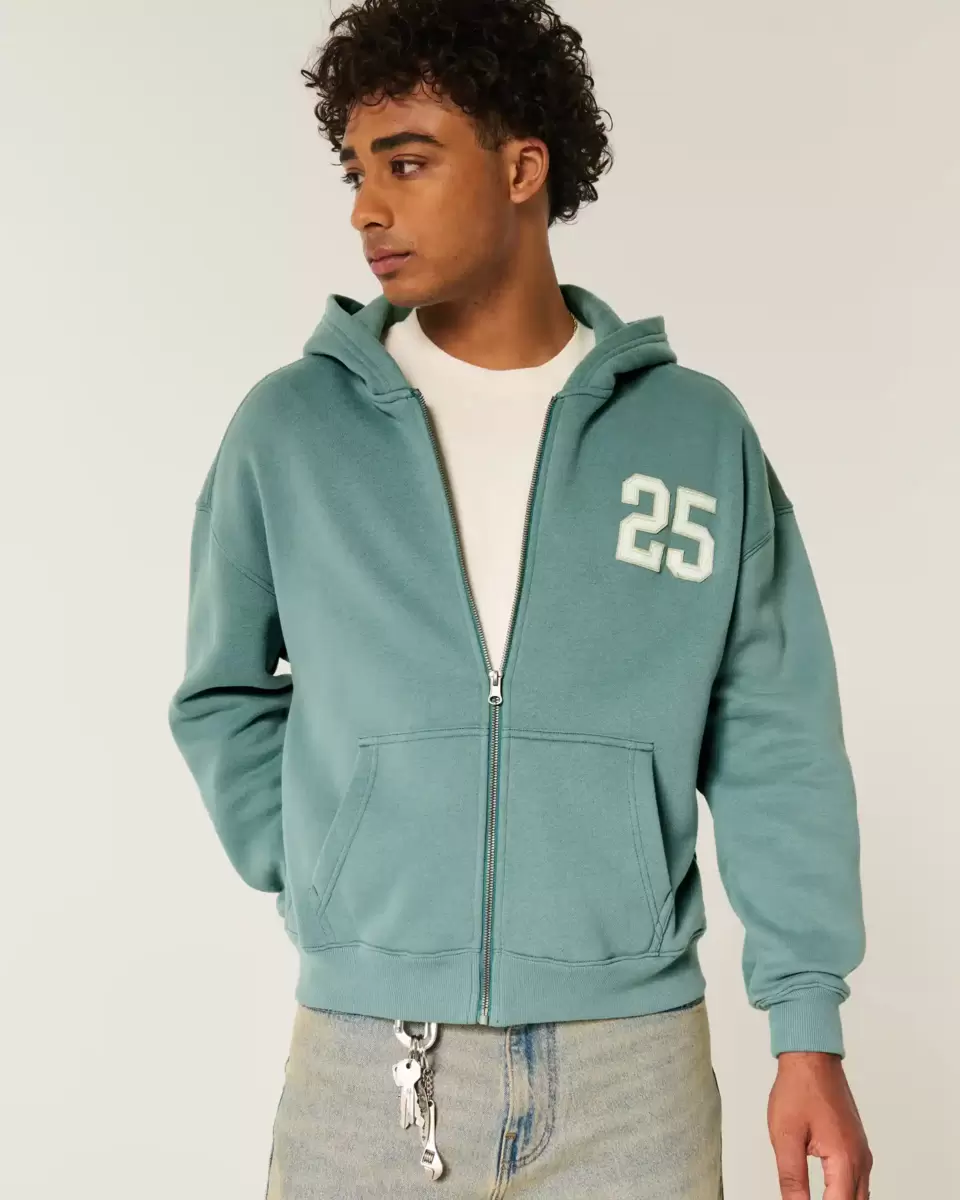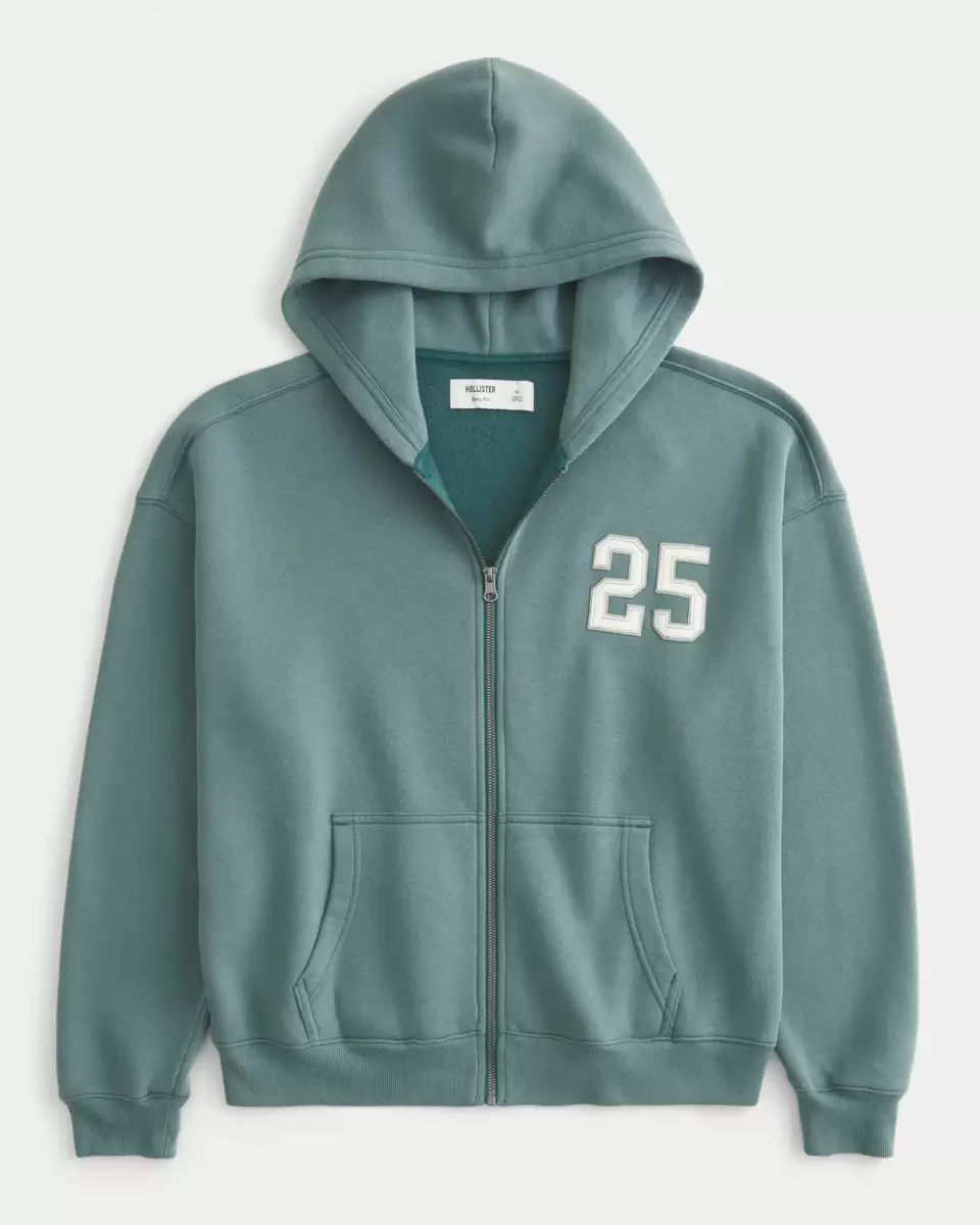 Ce sweat à capuche en polaire ultra doux est orné d’un motif graphique inspiré du football universitaire appliqué sur le côté gauche de la poitrine. Fermeture éclair sur toute la longueur, capuche, poches avant et manches longues. Coupe carrée. Importé.