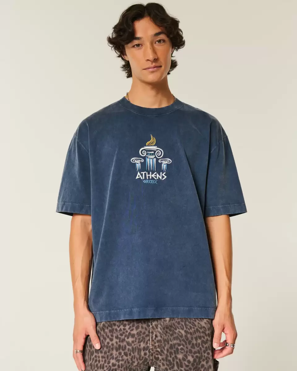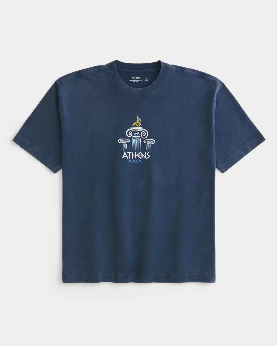 Ce t-shirt ultra doux est confectionné en 100 % coton épais et arbore une broderie représentant Athènes, Grèce. Encolure ras du cou, manches courtes et coupe carrée.