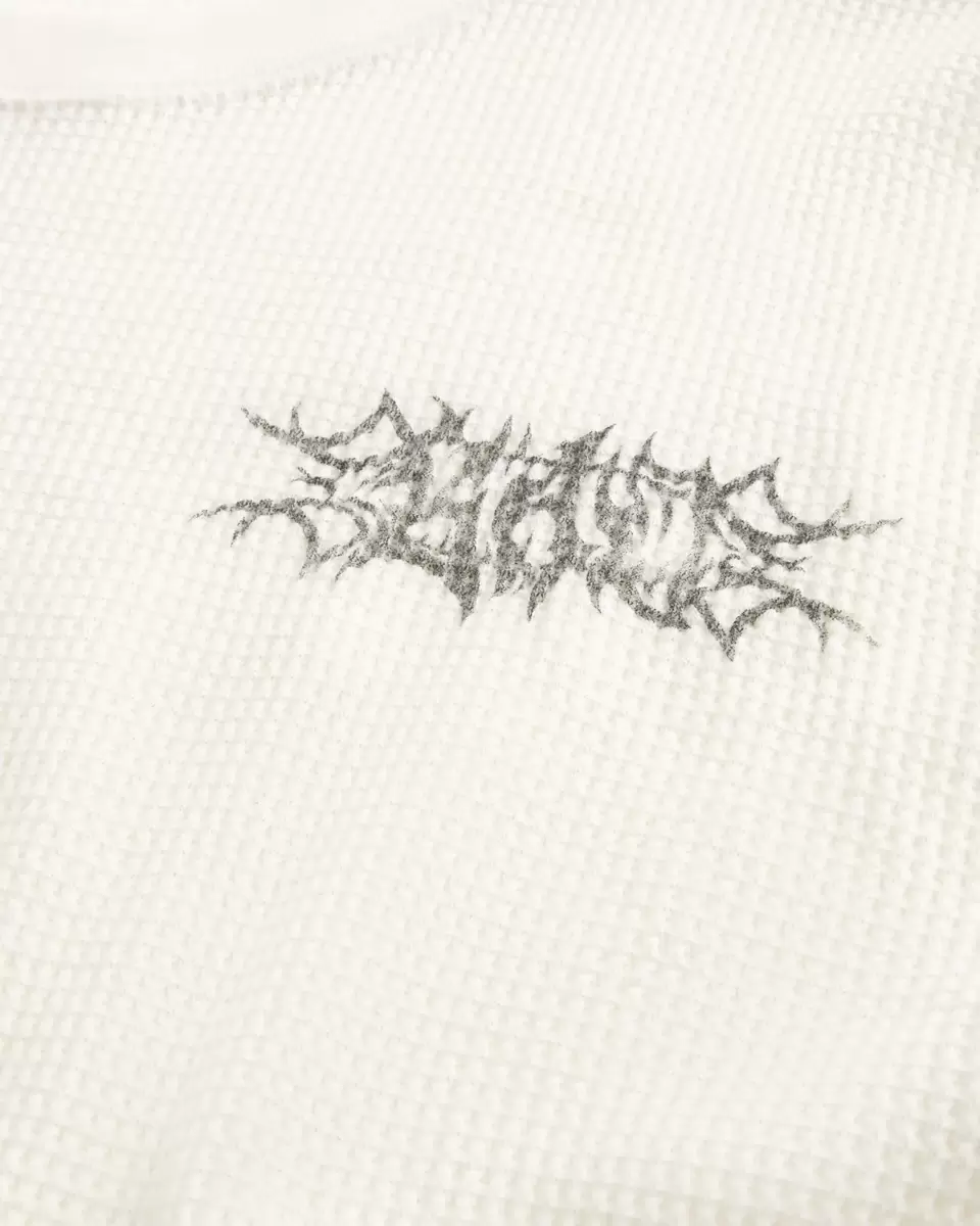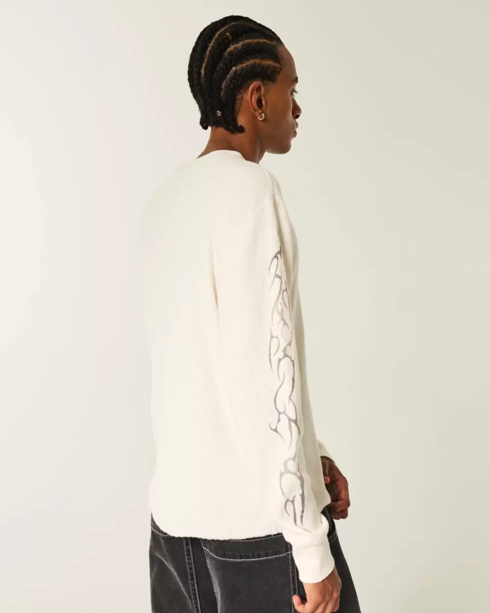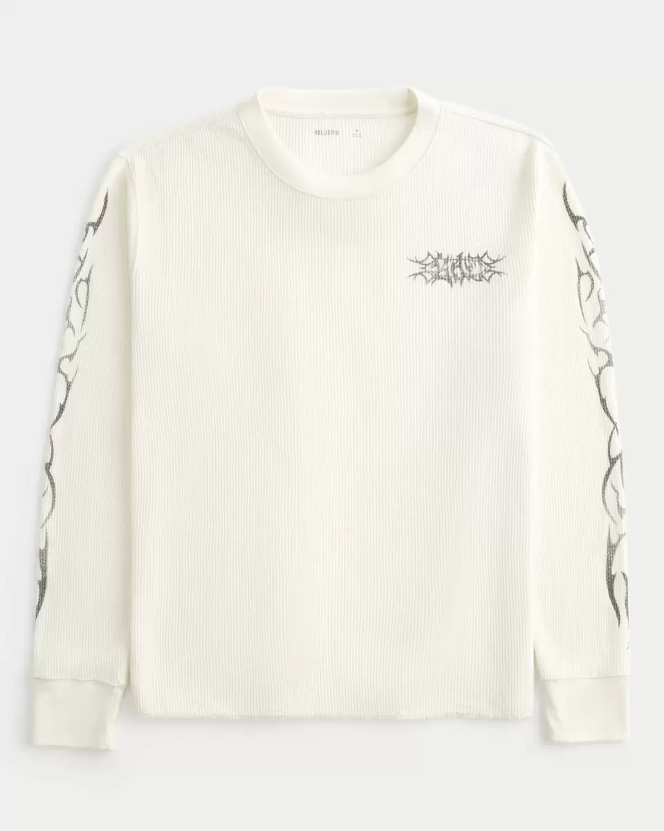Chemise thermique à manches longues d’inspiration années 2000 en tissu gaufré ultra doux. Encolure ras du cou, imprimé graffiti sur les manches et sur la poitrine gauche. Importé.