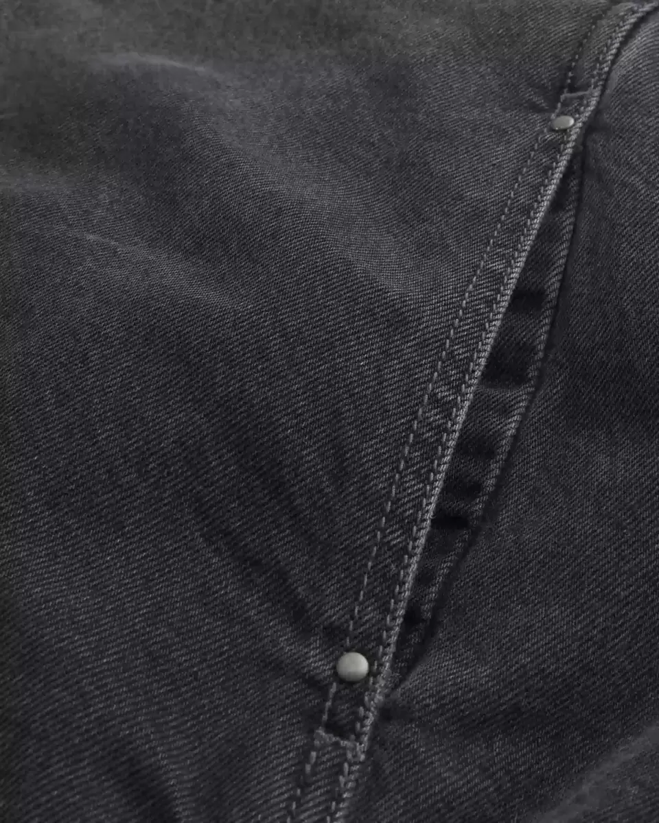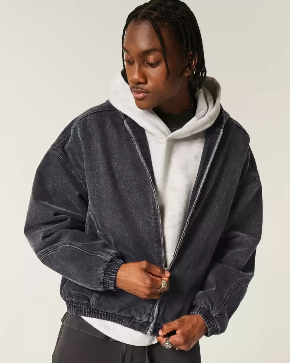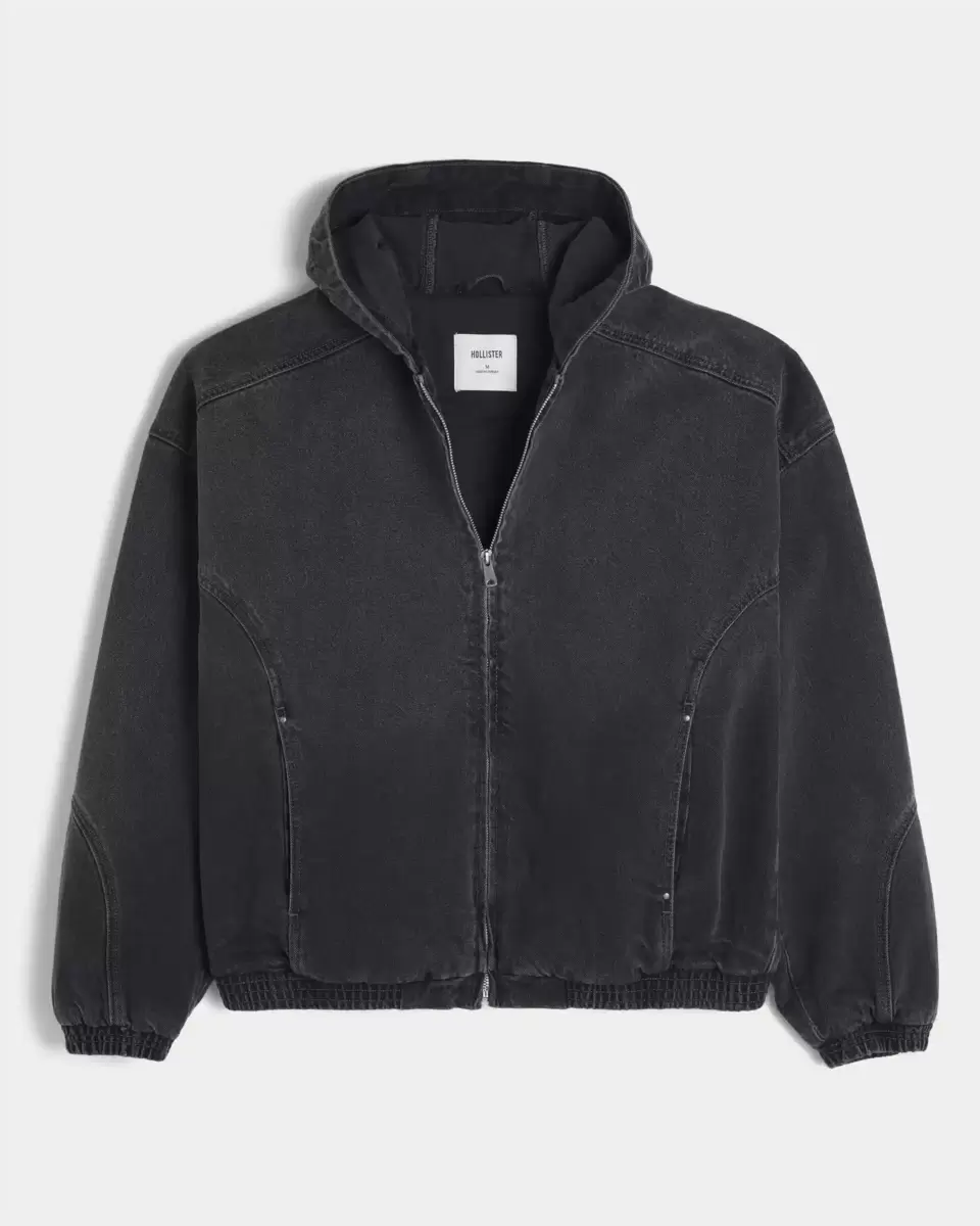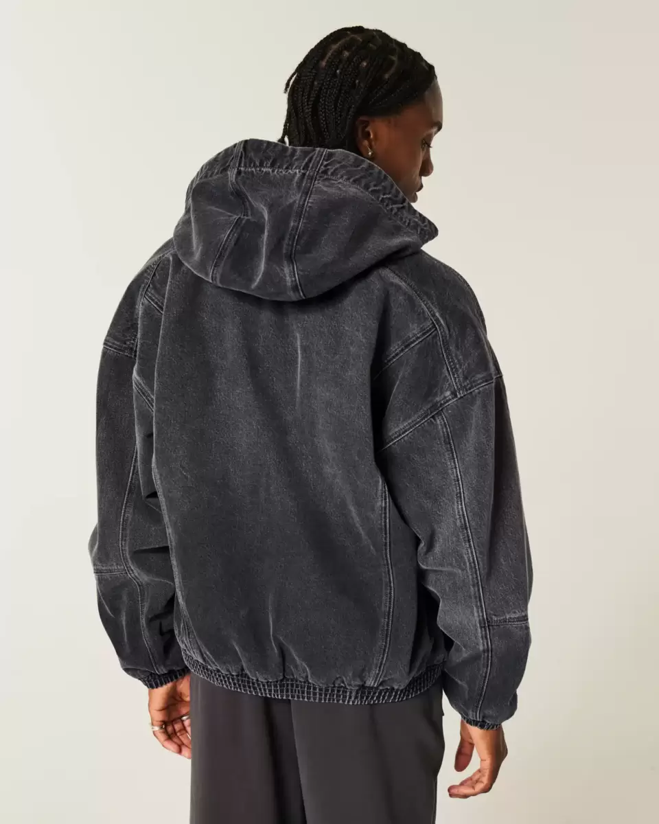 Veste de style patineur classique avec fermeture éclair intégrale. Poches avant, capuche et extérieur en denim. Importé.